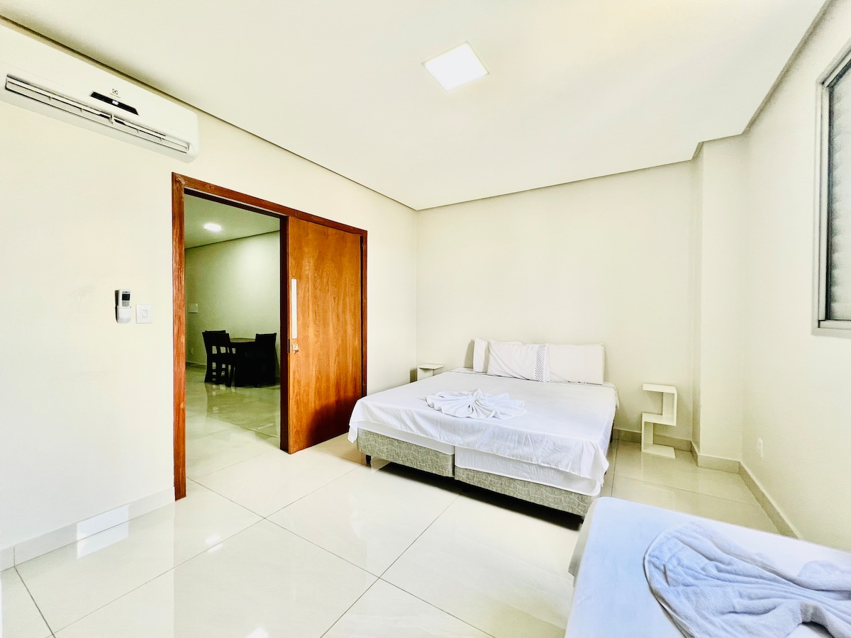 Apartamento novo e completo, ideal para curta estadia. Ambiente silencioso, confortável e funcional, com Wi-Fi rápido, ar-condicionado, cozinha equipada e varanda. Espaço organizado, moderno e acolhedor, perfeito para casais, viajantes a trabalho, turistas e mochileiros. Localização central, a 5 minutos do centro, com acesso rápido à avenida principal, aeroporto, hospitais, supermercados e comércios. Praticidade, conforto e ótima localização em um só lugar.
