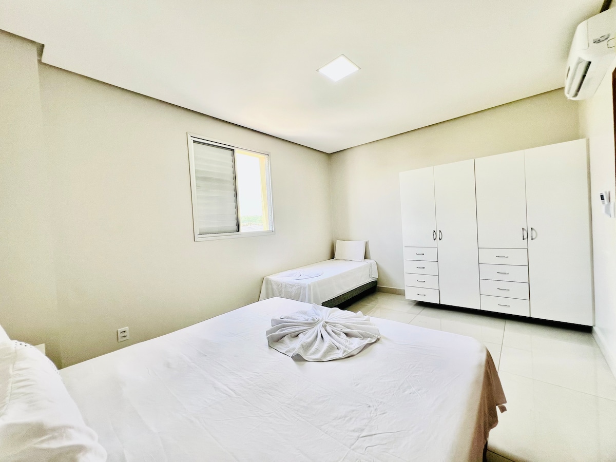 Apartamento completo e confortável em Montes Claros, próximo ao shopping, padarias, restaurantes e farmácias— faça tudo a pé! Acomoda até 5 hóspedes com cama de casal, cama de solteiro com auxiliar , sofá-cama e colchão extra. Conta com ar-condicionado, Wi-Fi rápido e cozinha equipada. Ambiente limpo, organizado e acolhedor. Oferecemos toalhas, sabonete, shampoo, condicionador e itens básicos. Ideal para trabalho ou lazer. Reserve agora!