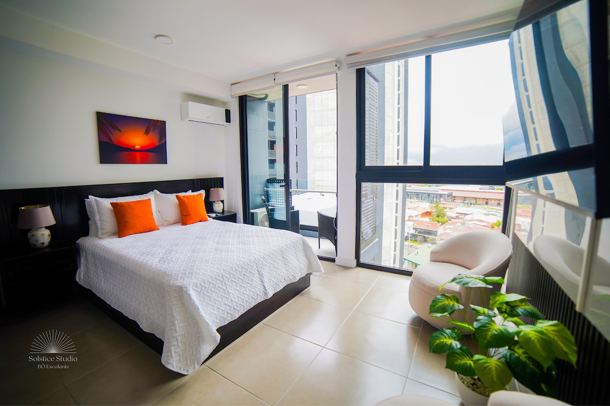 Lets chat for a FREE early check in 24/7 security, ONLY building to park a PICK-UP Get up in the morning to the most magnificent view of Irazú Volcano, enjoying a cup of the most amazing costarican gourmet coffee. Get on to the amenities to enjoy a relaxing session in the Sauna or Hot Tub, put in a day of work then go out for a 2 minute walk to a delicious restaurant finally back home a comfy queen bed will welcome you. Tons of public transport available including a small train station.