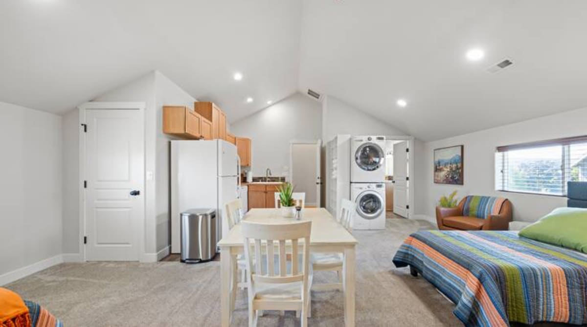 The Cottonwood Cottage is a modern, cheerful, family friendly, pet friendly home, ready to delight our guests. The kitchen has every amenity needed for cooking simple or gourmet meals. It is open to the living room so guests can be in the same space during meal preparations. The primary bedroom has an attached bath. The shady, fenced back yard is ideal for relaxing and outdoor dining, with a covered patio and patio table and chairs.
