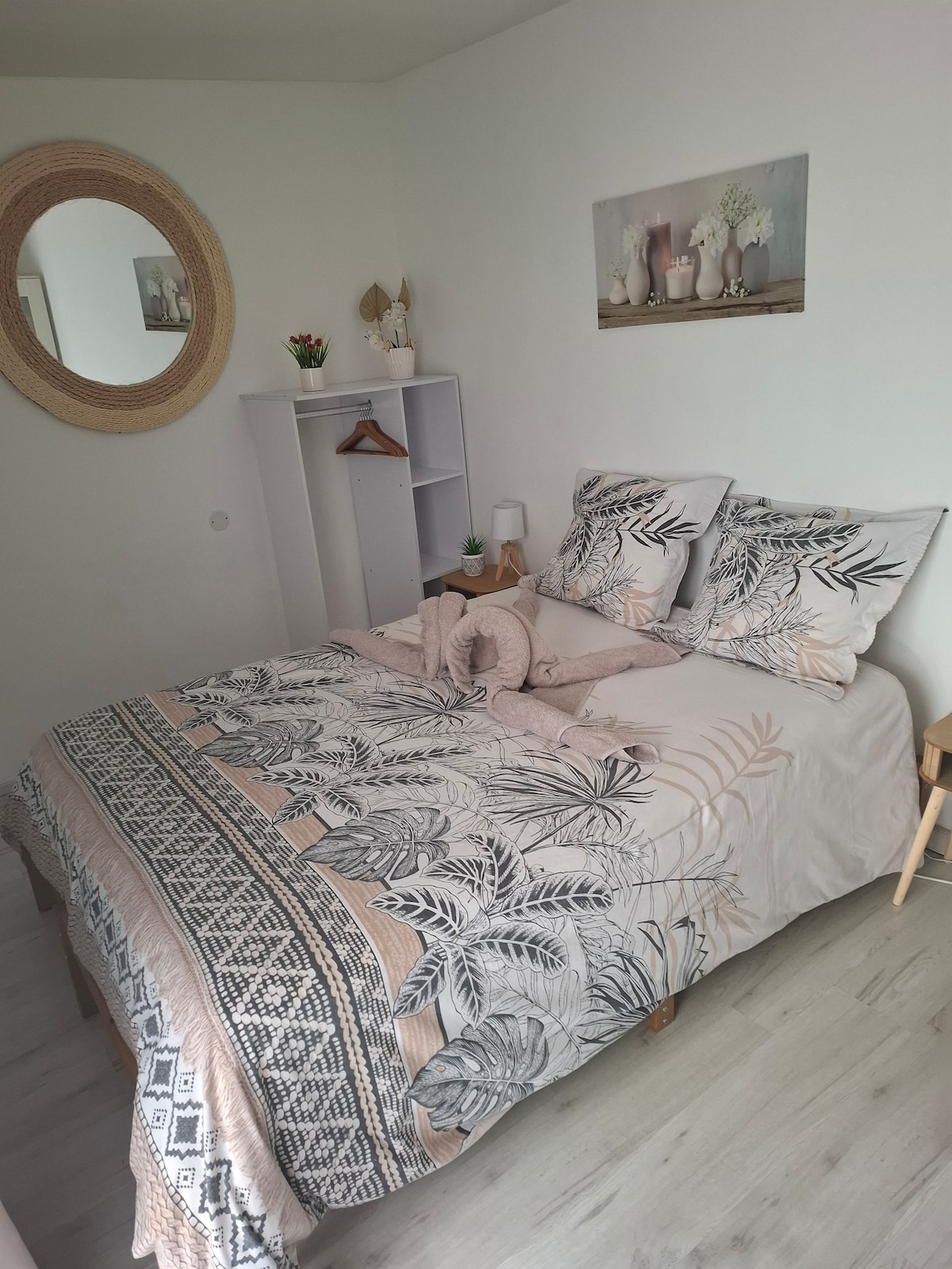 Passez un agréable séjour dans cet hébergement neuf 24 m2 cosy et lumineux, équipé pour 2 Vous disposez d'une pièce vue jardin, lit 160, couette, oreillers, commode, armoire, télévision, wifi, climatisation réversible, kitchenette équipée, table, chaises Salle de bains douche à l'italienne, vasque, sèche serviettes, sèche cheveux , WC Armoire buanderie avec lave linge, nécessaire pour entretien et nettoyage, fer et table à repasser, étendoir. Espace extérieur plancha, table, chaises, transat