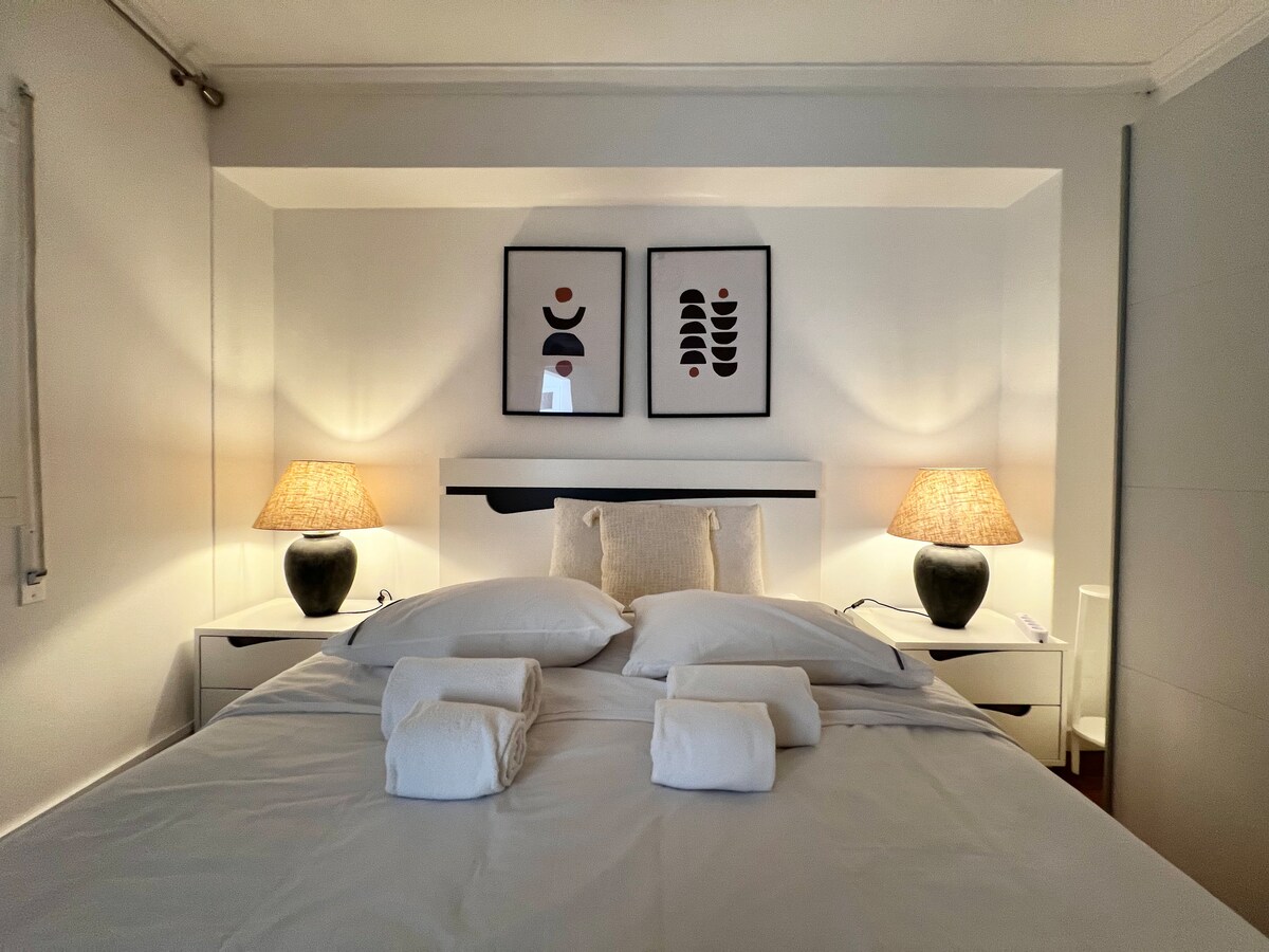 Decoração simples e moderna (guarda roupa, gavetas, mesa e cadeiras, terraço com mesa guarda-sol e cadeiras). Pequeno espaço de cozinha com forno, microondas, fogão e frigorífico. Casa de banho completa. Alguns utensílios de cozinha, como talheres e louça. Tábua, ferro de engomar, e televisão. Irei receber os hóspedes pessoalmente, falo inglês e alemão.