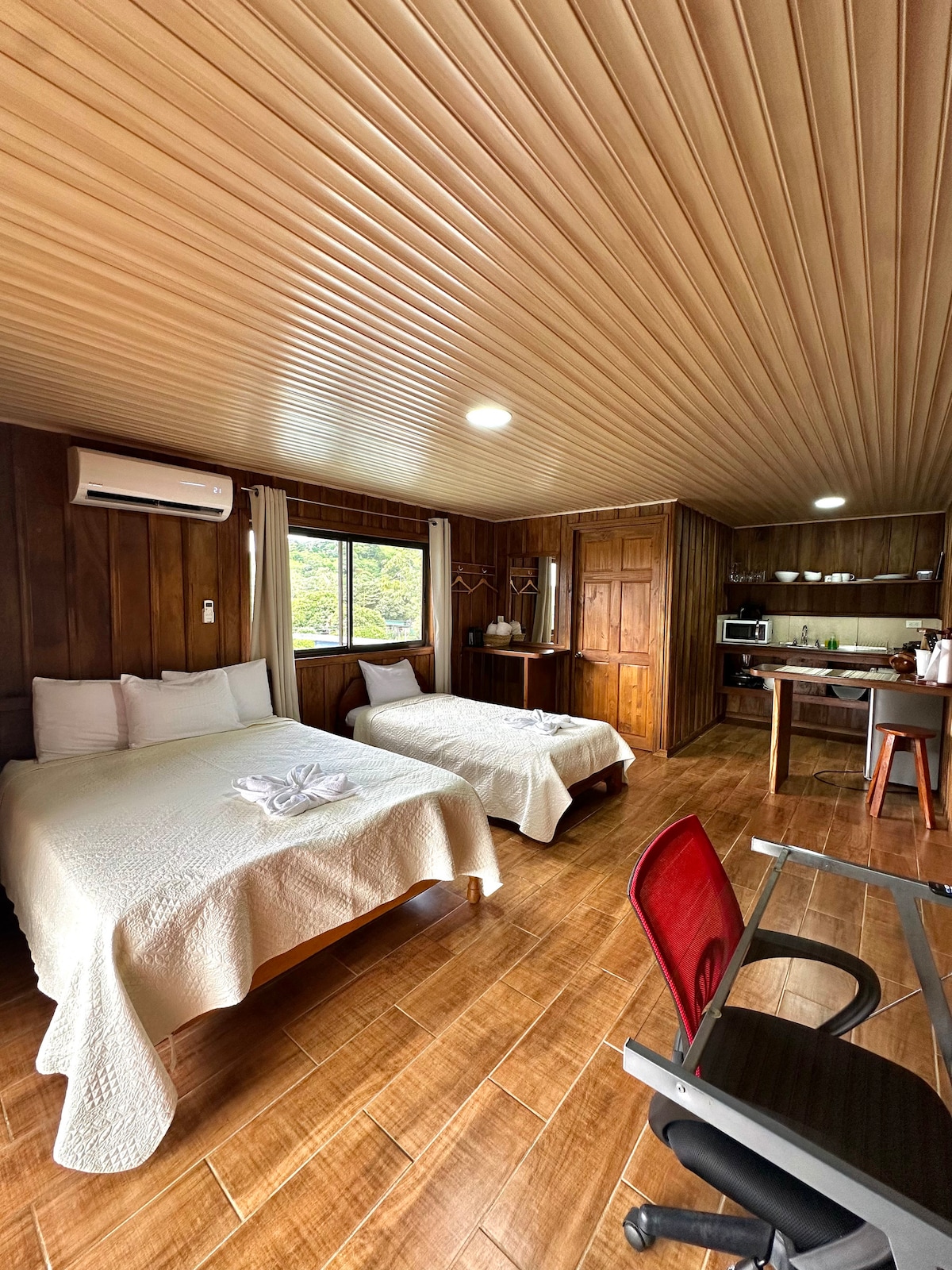 Cloud Forest Cabin sits on the second floor and opens to a clear view of the surrounding mountains. Large windows fill the space with natural light and highlight the warm wooden details. It features a queen bed and a single bed, a 55” TV, air conditioning, heating, and a fully equipped kitchen. The private balcony, with its outdoor table, is perfect for relaxing and enjoying the fresh mountain air. A simple, comfortable space surrounded by nature.