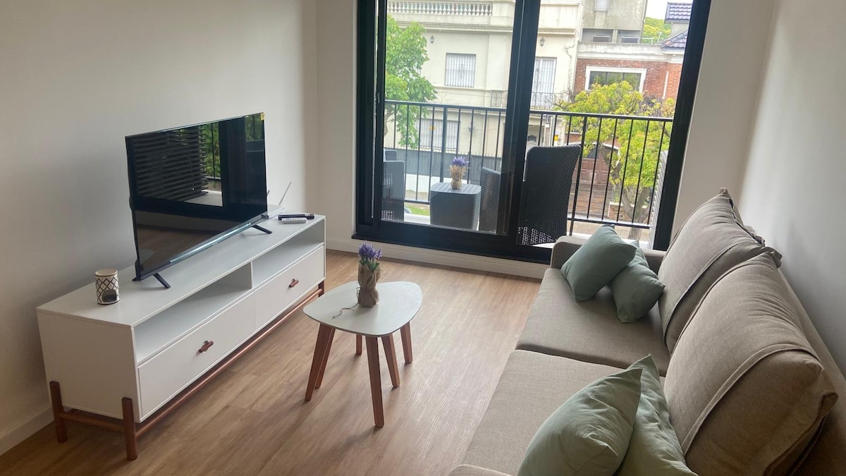 Charming apartment in Pocitos, close to bars, squares, restaurants, and more. Located on the second floor, accessible by stairs (no elevator). Fully equipped with a 55" TV, Bluetooth audio system, kitchen appliances, and more. Features a high-performance stove for winter, air conditioning, and everything needed for a perfect stay. Includes a workspace with desk, office chair, and display (not shown in photos). Bright with natural light, a terrace with BBQ, and fast, stable internet.
