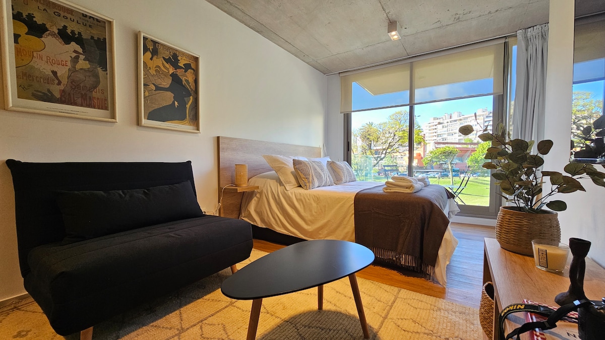 Diseño con vista al Parque y al Mar en el mejor lugar de Punta Carretas Este Estudio es ideal para descansar y disfrutar mientras visitas Montevideo. A corta distancia de restaurants, bares, shopping center y el club de golf. Aire acondicionado, Wi-Fi, Netflix, Prime video, Nespresso® con cápsulas incluidas, colchón premium, toallas de algodón, sábanas de algodón de alto conteo de hilos. Auto check-in y acceso permanente durante su estadía con la cerradura inteligente Yale® Smart lock.