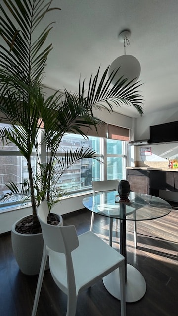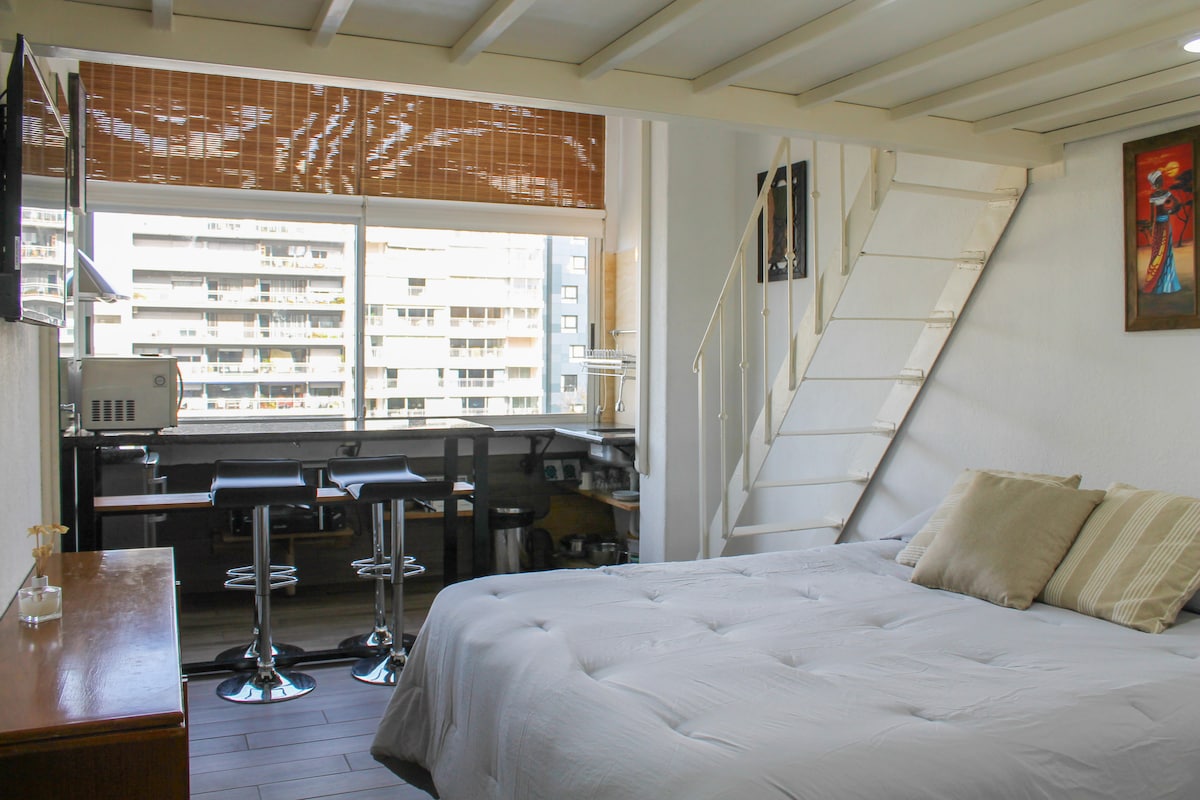 Monoambiente único en Montevideo! Reciclado estilo Industrial/contemporáneo con vista directa al mar y toda la bahía/playa de pocitos. Ubicado en el histórico edificio "Rambla" en el barrio Pocitos, una de las zonas mas exclusivas, comunicada y segura de la ciudad. Imagínate desayunar en la barra de la terraza con una impactante vista antes de un día de paseos, para luego volver a descansar en un colchón cómodo y un estudio acogedor y calefaccionado. Eso es lo que es nuestro apartamento.