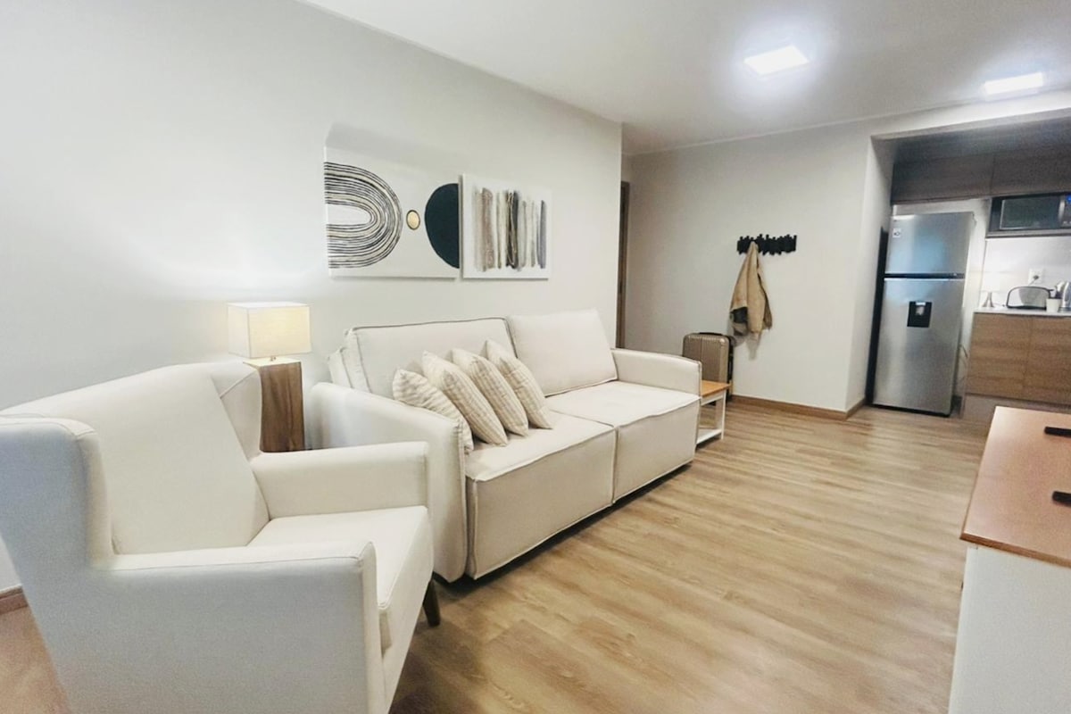 Frente a la playa, mucha iluminacion, full equipado con wifi y TV Smart. Edificio nuevo en Malvin sobre la rambla, frente a "Playa Honda". Hermoso! (Consultar detalles por " excepciones" si su reserva es para 3 adultos!!). 2 adultos + 1 menor sin problema, 2 adultos + 2 menores quizá incomodo, 1 adulto + 2 menores quiza incomodo. Porque es de 1 habitacion con cama matrimonial y sofa cama en el luving.