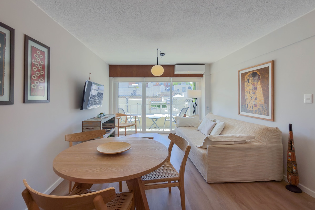 Departamento cómodo y luminoso a pasos del centro y la rambla. Ideal para disfrutar actividades al aire libre, buena gastronomía y fácil acceso al transporte. Totalmente equipado: vajilla, ropa de cama, toallas, Wi-Fi. Ubicado en tercer piso con ascensor y vigilancia en el edificio y su entorno.