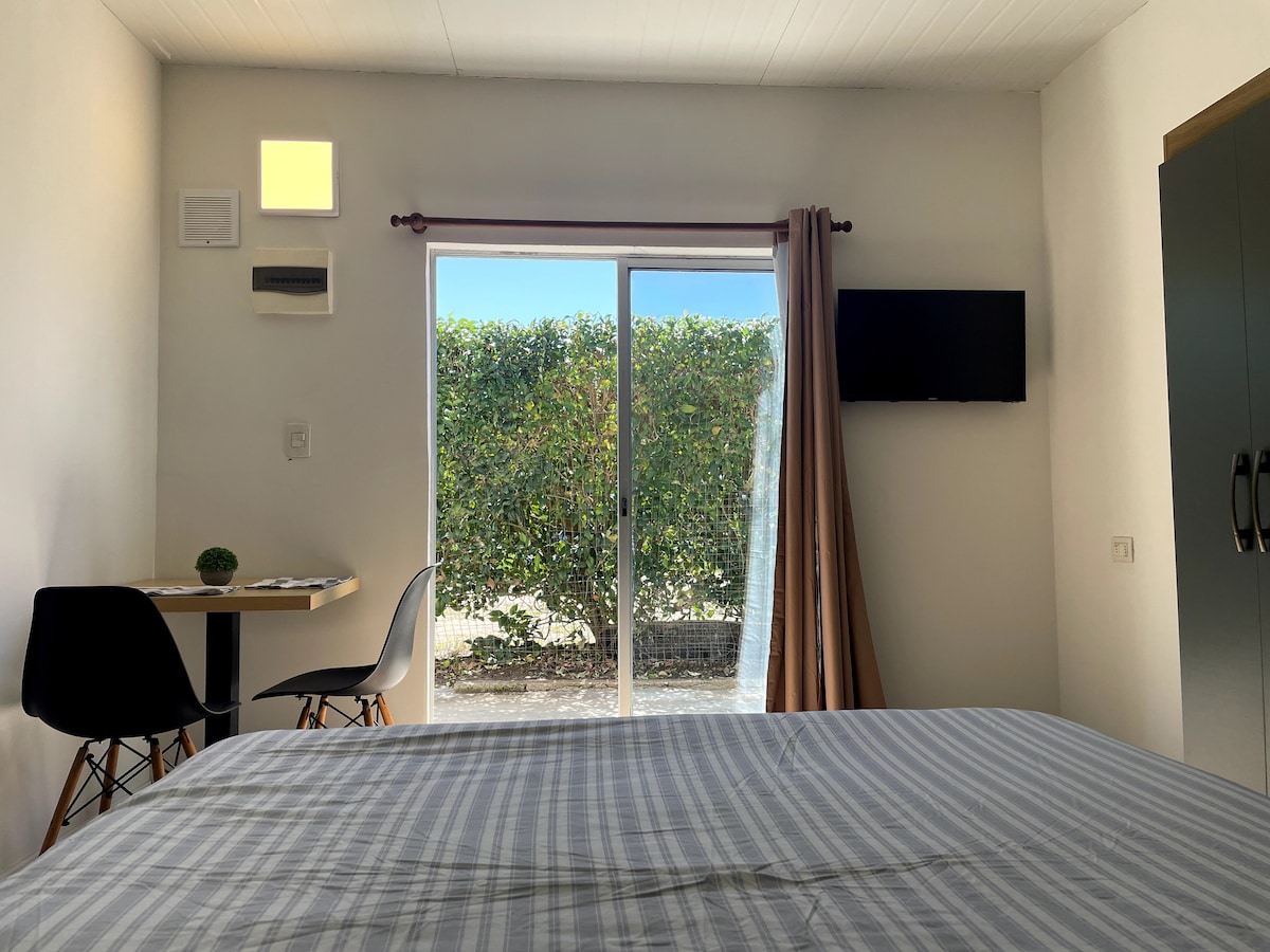 Apto privado al fondo con entrada independiente a pasos del nuevo centro shopping, un buen punto para conectar con toda la ciudad. Está en el fondo compartido con mi casa, donde habita nuestra perra, Clara (una adorable Golden). En el entrepiso está el dormitorio con un sommier de 2 plazas y tv smart 32. Abajo se encuentra la sala con ventanales hacia el fondo y un baño completo. Hay una barbacoa techada contigua que se puede utilizar, con la opción de un área para cocinar.