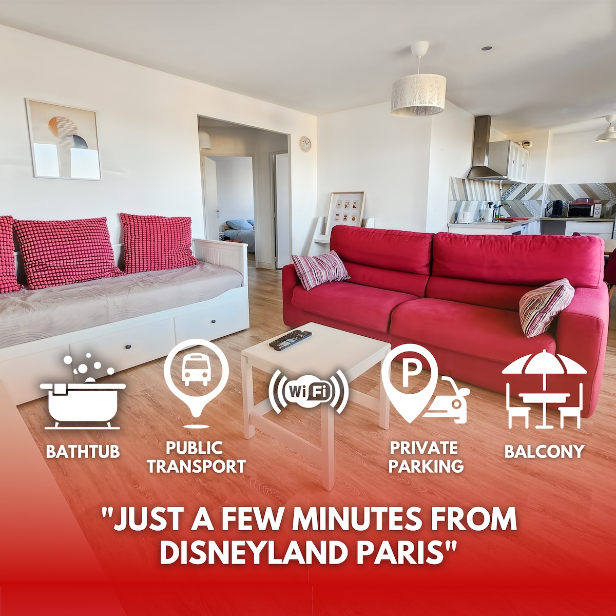 Bienvenue dans « La maison de Mickey », où la magie illumine chaque instant. L’appartement est situé à seulement 5 min à pied du RER A "Val d'Europe", qui vous transporte en 5 min au royaume magique de Mickey et en 35 min au cœur de Paris. Plus qu'un appartement, c'est une porte ouverte vers un monde féerique où chaque détail est pensé pour vous plonger dans l'univers de Disney. Laissez la féérie commencer ici et vivez des moments inoubliables avant même de franchir les portes du parc !