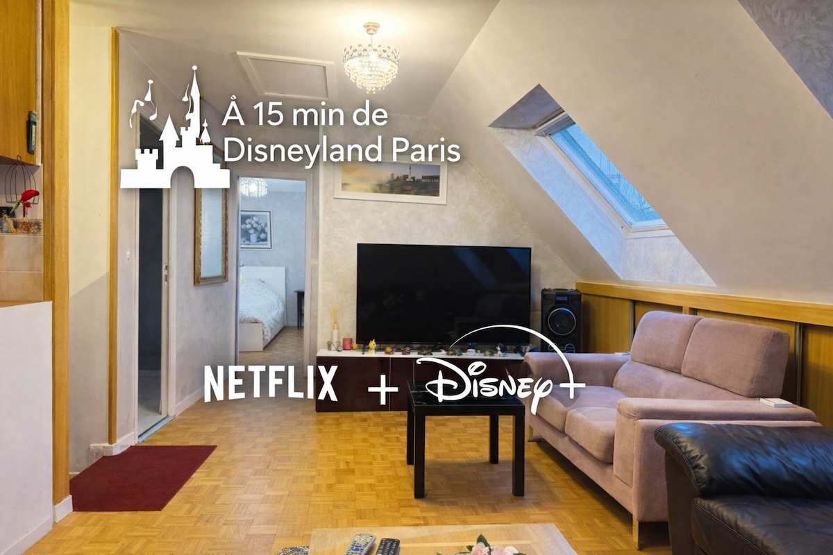 Charmant appartement sécurisé de 33m2 proche de Disneyland Paris ! 😊 Le RER A est à 5min à pieds du logement et vous conduira à Disneyland Paris en moins de 10min. Le logement dispose : - d’une chambre avec un lit double et un canapé lit d’une dimension de 140cmx190cm ( lit enfants ) - d’une cuisine équipée - d’une télévision et WIFI gratuit - de gel douche et serviettes fournis - d’une place de parking si besoin De nombreux commerces, restaurant et fast-food sont accessibles