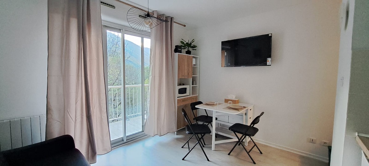 Magnifique studio 4 places avec vue sur la montagne et l'Ariège. Proche de la gare et du centre ville d'Ax les thermes. Chemin pédestre longeant la rivière pour accéder au centre ville d'Ax. Casier à ski et parking gratuit sur place. studio au 2 ème étage avec ascenseur. Un canapé lit double dans le séjour et un lit superposé 2 places dans chambre séparée. Salle de bain avec baignoire et cuisine tout équipée. Balcon sans vis à vis avec petite table d'extérieur. Linge de maison non fourni.