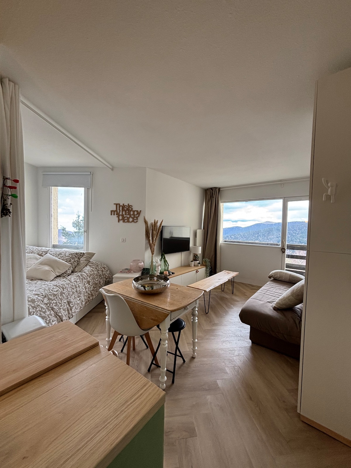 Notre cocon est disponible! 🧡🤍 Venez découvrir les Monts d'Olmes version nature! 🪵🌿 Lacs, balades avec les enfants, randonnées, calme, ... le BON-HEUR! 🤍🧡 Le studio dispose d’un patio, plein sud avec vue sur les pistes, au 1er étage avec ascenseur, parking gratuit. Équipements: 2 lits simples + 1 lit double (BZ convertible), cafetière Nespresso, téléviseur, jeux et DVD, kitchenette avec micro ondes,… Décoré avec amour dans une ambiance cosy, vous vous y sentirez comme chez vous! Pauline 🙋🏼♀️