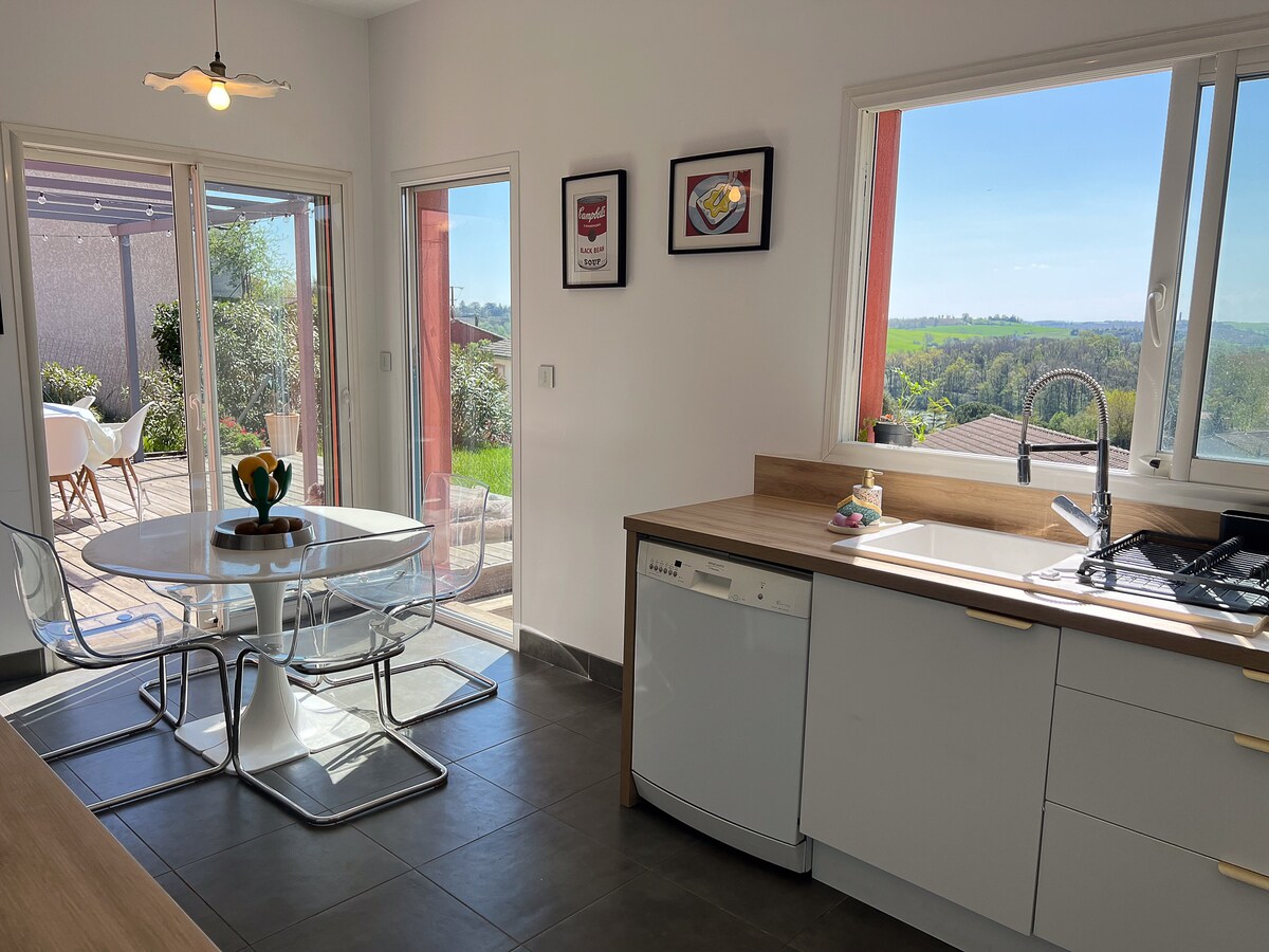 Bright apartment with a private terrace and beautiful views of the hills. Perfect for a peaceful stay just 25 minutes from Toulouse city centre (Carmes district). The pool and garden are shared in a friendly, family atmosphere. Fully equipped kitchen, Wi-Fi, Smart TV and workspace. Access by stairs with handrail (not suitable for wheelchairs).
