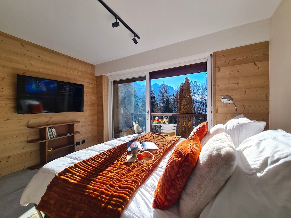 En rez-de-jardin, appartement de 55m2, plein sud, meublé dans un style à la fois moderne et montagne. Vue sur les sommets. Séjour spacieux avec canapé, télé 127cm. 2 chambres avec lits de 160cm, grands placards et penderies. Une chambre avec TV. Terrasse et jardin de 60m2. Pour votre confort, en complément des équipements de base, vous trouverez bouilloire, grille-pain, appareil à raclette/grill/crêpière, appareil à croque-monsieur/gaufres...Le ménage de fin de séjour est inclus.