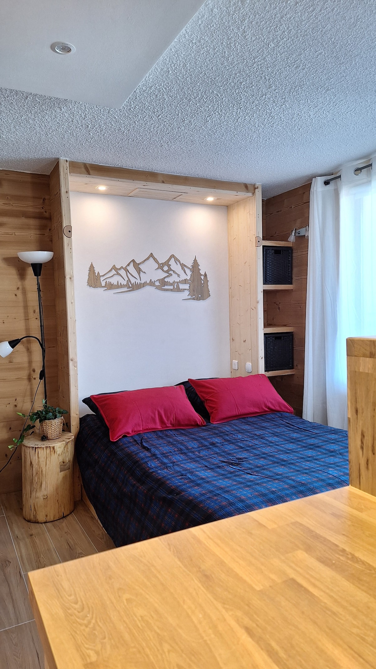 Agréable studio 32 m2, coin cuisine séparé de la pièce principale par un passe plat. ( lave-vaisselle, plaque vitrocéramique, micro-ondes). Pièce: canapé lit pour 2 , des lits gigognes, une table rabattable, une armoire, une télévision. Coin montagne: 2 lits superposés, placard Salle de bains rénovée (baignoire, lavabo, placards, lave-linge). balcon casier à skis emplacement de parking couvert. à 5 minutes des commerces, et près des pistes de ski.