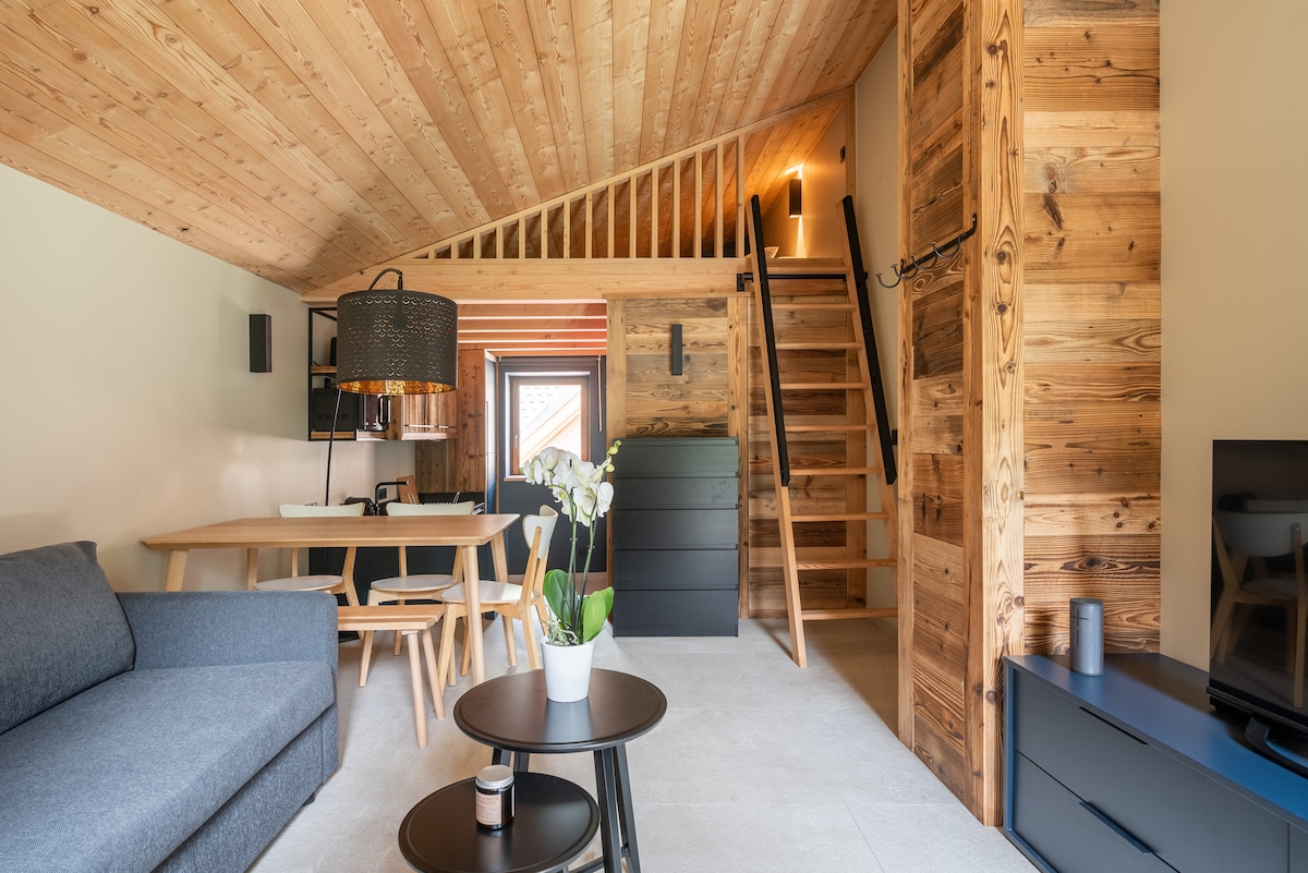 Le chalet offre de tous cotés une vue panoramique sur les sommets. Outre la pièce à vivre dont les baies vitrées donnent l'impression d'habiter le paysage, l'étage offre 3 chambres (2 fermées) et une sdb, toutes dotées de grandes ouvertures pour multiplier les points de vue. L'aménagement intérieur, mélange d'authenticité et de contemporain, adopte le style chalet en fil rouge, en accord avec le bois dominant, laissé naturel. Le choix des teintes et des matières assure une ambiance cocooning.