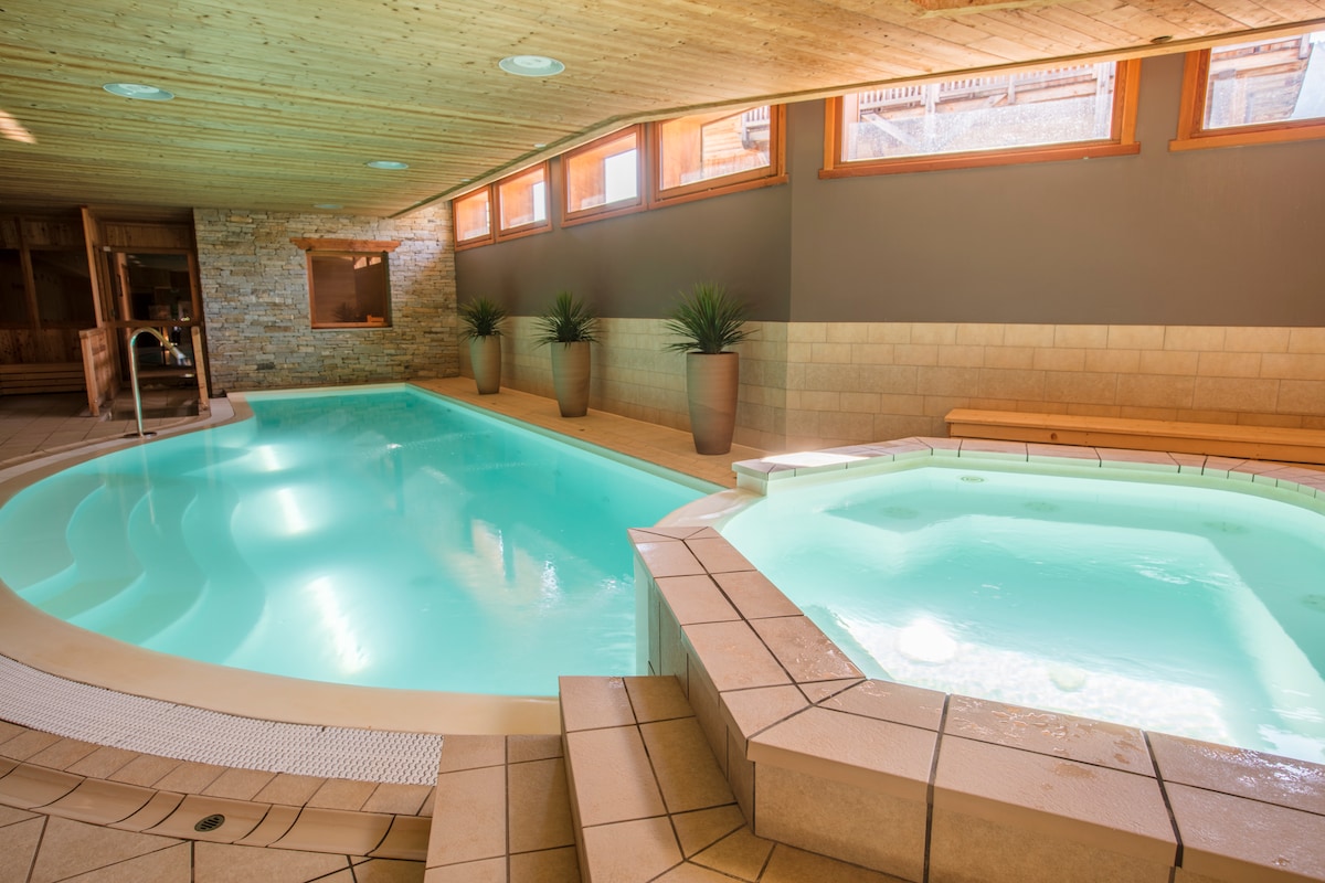 En rez-de-jardin, appartement de 55m2, plein sud, meublé dans un style à la fois moderne et montagne. Vue sur les sommets. Séjour spacieux avec canapé, télé 127cm. 2 chambres avec lits de 160cm, grands placards et penderies. Une chambre avec TV. Terrasse et jardin de 60m2. Pour votre confort, en complément des équipements de base, vous trouverez bouilloire, grille-pain, appareil à raclette/grill/crêpière, appareil à croque-monsieur/gaufres...Le ménage de fin de séjour est inclus.