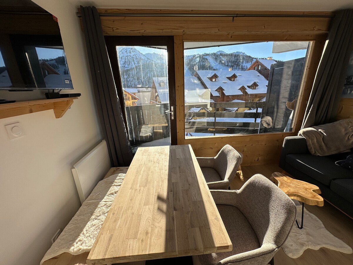 This warm, luxurious, fully-renovated apartment features a fully-equipped kitchen, a fold-down bed for added comfort (1.40m x 2m) in the living room, bunk beds in the mountain area, separate toilet and bathtub. Direct access to the slopes from the residence's ground floor. Close to the Durancia spa and golf course, common areas with ping-pong tables for relaxation. Beds made on arrival, bathroom linen, kitchen linen, Nespresso coffee maker... provided.