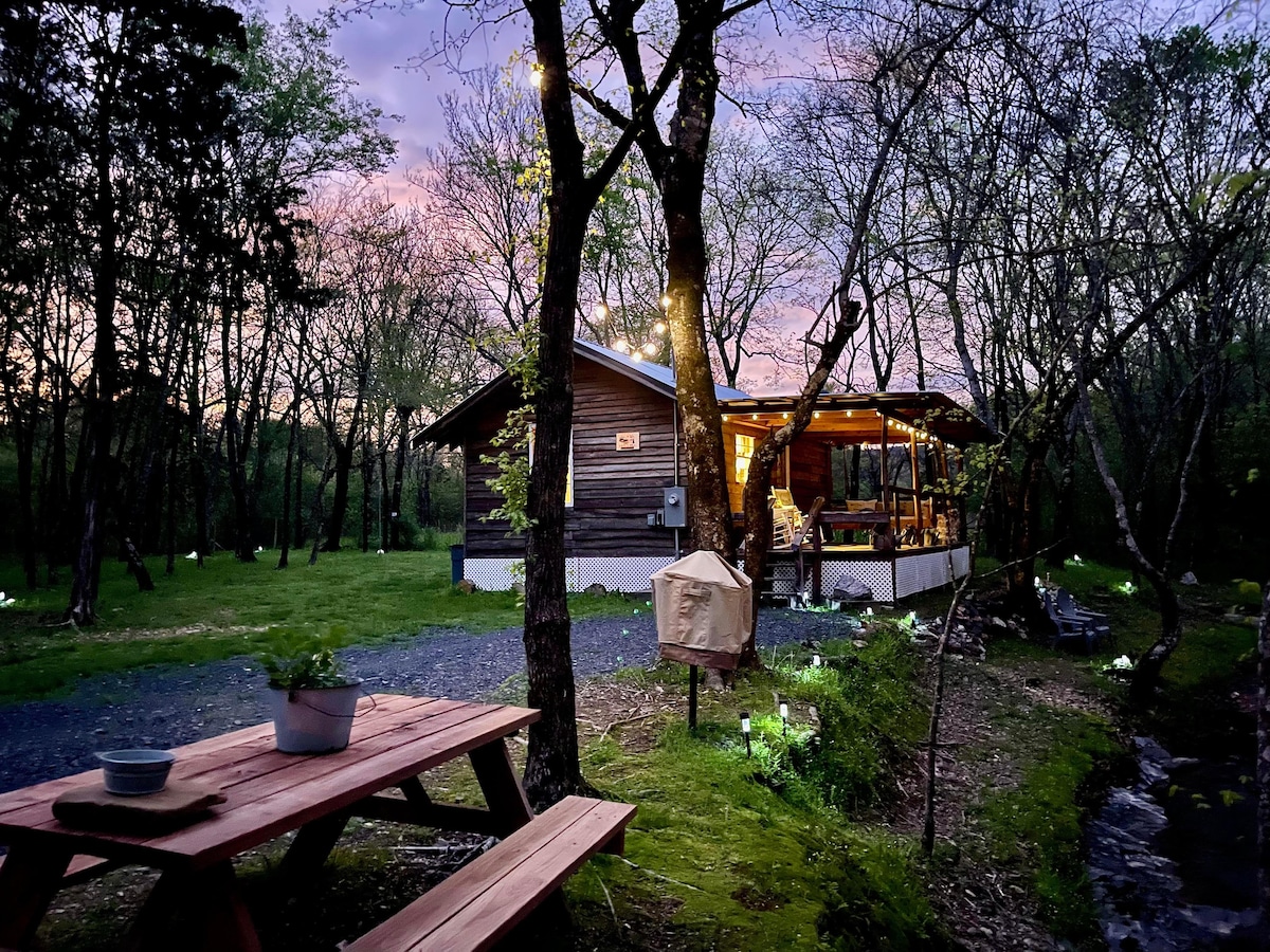 Built 2018, inside bathroom remodeled 2023. Studio cabin. King bed, adult twin bunk beds, large leather sofa, big covered deck, swing, grilling, soaking. Beautiful spot relaxing, soakin, float or exploring Surrounded by trees/deers. Hiking trails We have Collier & Caddo Cabins. Prettiest creek! Gurgling/cool crystal clear No dog fee! Hardwood floors, free long-distance, Patio overlooking creek! WiFi & directtv. Trees, deers & bonus fully plumbed Out house! Please stay on our property & creek!