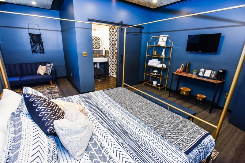 Each room is steeped in rich, dark indigo hues created for comfort. Well-appointed furnishings are crisp yet casual and paired with historic touches of exposed ceilings and brick walls. Each stay is a distinctive experience in urban relaxation.