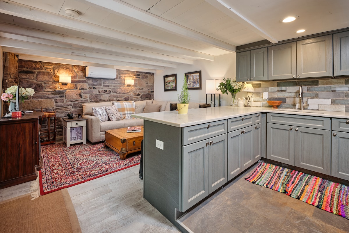 Private, tranquil historic Stone Cottage, situated on 11 woody acres of a colonial Buckingham Hills farm estate, cir 1793 minutes from Peddlers Village, New Hope, Lambertville, Doylestown. Cozy, romantic decorated with unique antiques and comfortable furnishings. Relax by an oversized wood burning fireplace, enjoy a large screen smart TV, explore the property & stargaze by an outdoor fire pit! Retrieve to the 2nd floor spacious master bedroom with an extra plush king size orthopedic mattress.