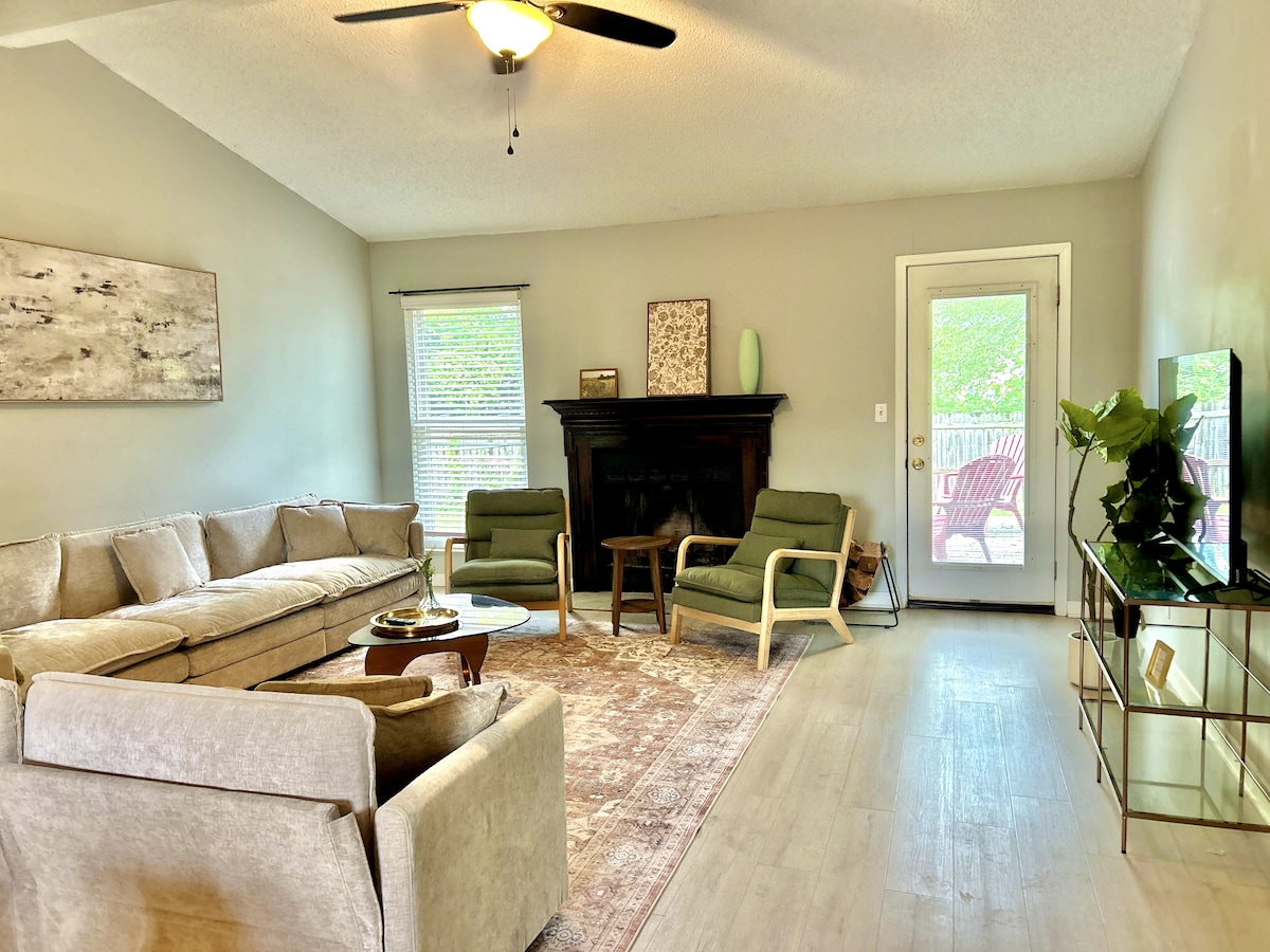 MONTHLY STAYS WELCOME! Relax next to the fireplace or cook up a meal in the fully equipped kitchen; this home has everything to make your stay great in Clarksville! Minutes to APSU & Downtown Clarksville, 20 mins to Fort Campbell; 1 hour to Nashville -Keyless Entry and self check-in -2 Queen beds -Fully equipped kitchen -Disney Plus, Netflix, Hulu, Peacock -Beautiful covered front patio -Free Washer & Dryer This is the top level of a duplex. Guests may share outdoor spaces with other guests.