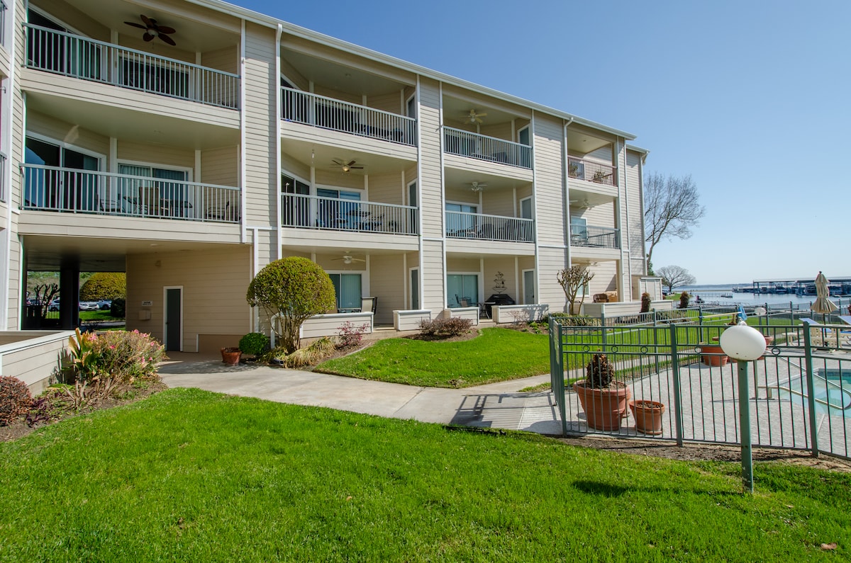 Gorgeous top floor Lake Conroe condo with free access to boat slip, boat ramp, kayaks, Yacht Club dining and pool, Racquet Club tennis, heated lap pool, fitness center, Lakeside Grille with live music. It's located in the closest building to the lake with the best views and the biggest size in the entire complex. Large kitchen and vaulted ceilings. Previous guests loved how clean our condo is, ideal location, beautiful view, and the many amenities plus boat rentals, golf, walking/biking trails.