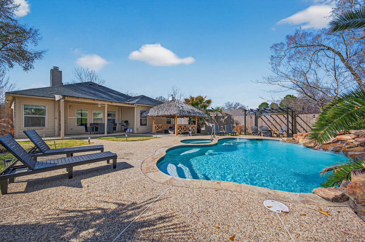 Texas hill country stone meets modern French farmhouse at this private luxury retreat on 5 wooded acres in Montgomery, Texas. This hidden gem has plenty of room for your group and is close to Lake Conroe! A warm, inviting fireplace in the living room opens up to a beautiful kitchen and dining area, overlooking a private pool with a lush grove of trees for a backdrop. The perfect space for your vacation or small event. Located near everything including Magnolia and The Woodlands.