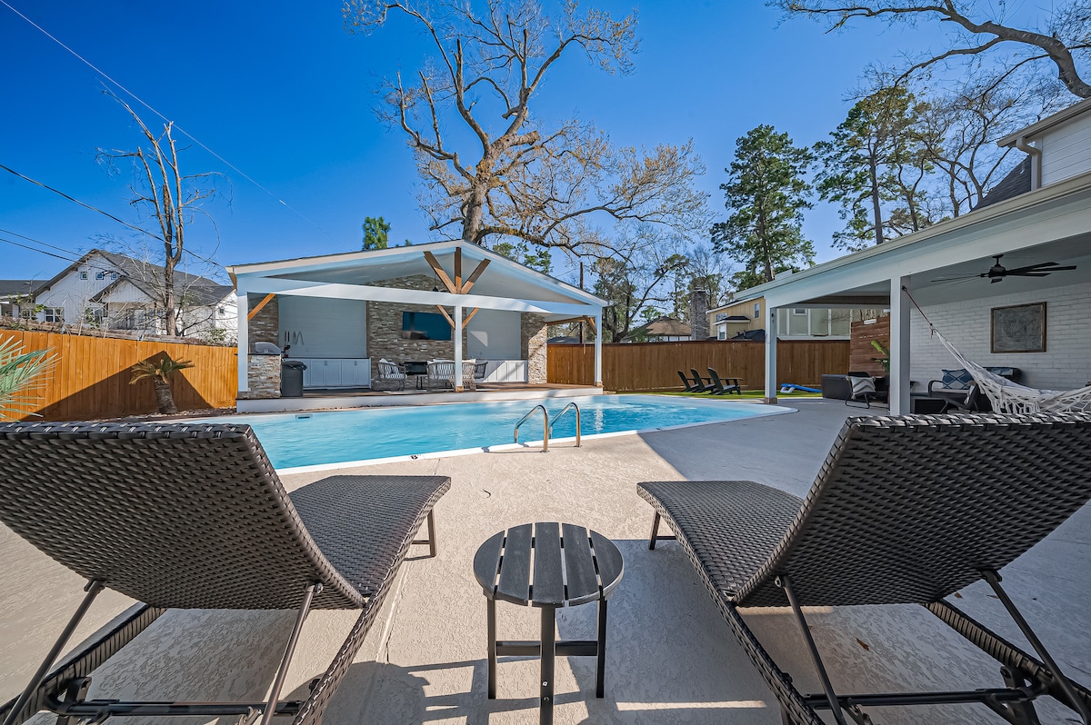This stylish place to stay is perfect for group trips near Lake Conroe and a host of water sports. Nested just minutes from the water, this charming 4-bedroom home offers the ideal blend of comfort, adventure, and tranquility. Whether you're here to cast a line, soak up the sunset, or gather loved ones, this retreat has everything you need. Patio with Gazebo and fire pit, spacious parking, fully equipped kitchen, extras you will love, with an open concept. Patio table and seating area.