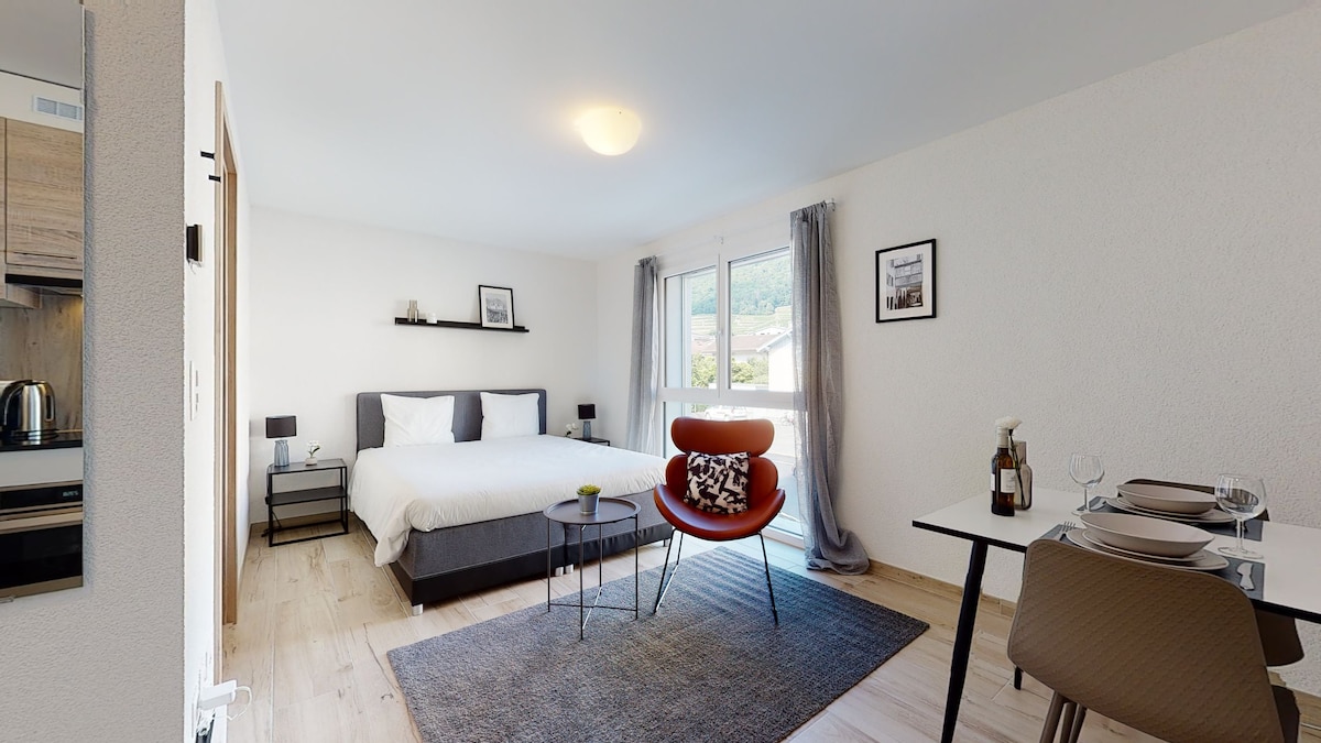Located on the top floor (4th floor), this apartment offers an amazing view of the Valais. This is a 1 bedroom unit with one confortable sofa bed for 2 and 1 bathroom (shower & separated bath tube). Great for family or 2 couples. Large balcony for smokers. Fully equipped kitchen with all ustensiles. ( Raclette, Fondue, Chinese Fondue, Grill, Plancha etc... ) with washer and drier Free parking & WiFi & channels (Amazon Prime, Netflix, Canal +, VOD) 10 minutes away from Montreux & Monthey