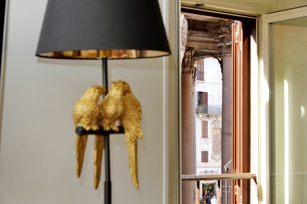 Exclusive and cozy apartment for tourist use with breathtaking frontal views of the iconic Pantheon,ancient Temples of roman Gods and Emperors.The100sqm apartment is a romantic retreat adorned with wooden beams that enhance its historic charm on the sofa in the living room with 3 French windows(Juliet balcony),overlooking the columns of the Pantheon. Here you can relax while drinking a cup of tea or glass of wine admiring the Pantheon as if it were at your fingertips.Completely renovated in2025