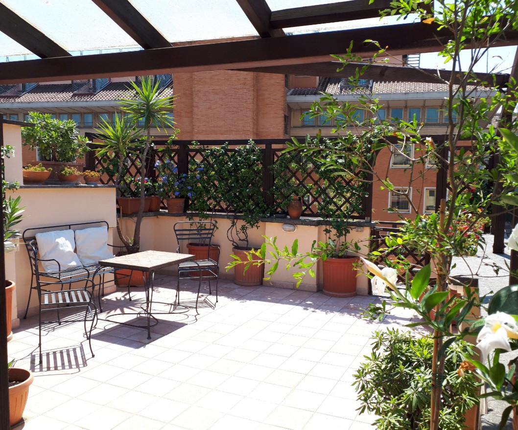 Our flat welcomes you to Roma, 13 min walk to Colosseo, 2 min to Vittorio Emanuele metro. Silent 7th top floor serviced by small lift up to 6th floor. It comes with a large kitchen-diner, a living room leading on sunny balcony, 2 spacious bathrooms with window, a double ensuite bedroom on the mezzanine (CEILINGS HIGH 5' 9") (175 cm) double sofa bed in the living room. Private rooftop terrace for your aperitivo accessible by external spiral staircase, will make your holiday unforgettable !