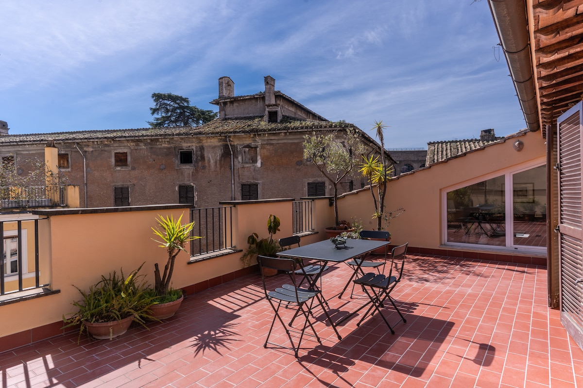 Bright and quiet penthouse apartment in the heart of Trastevere, with a wonderful terrace and an unparalleled view of charming roman roofs and the Gianicolo hill. The flat is meticulously refurbished and set in a picturesque cobblestoned street, just around the corner from the lively restaurants and cafes. La Casetta al Mattonato is located on the 3rd floor (41 steps, no elevator) of a 1600s typical roman building, within walking distance of all major attractions.