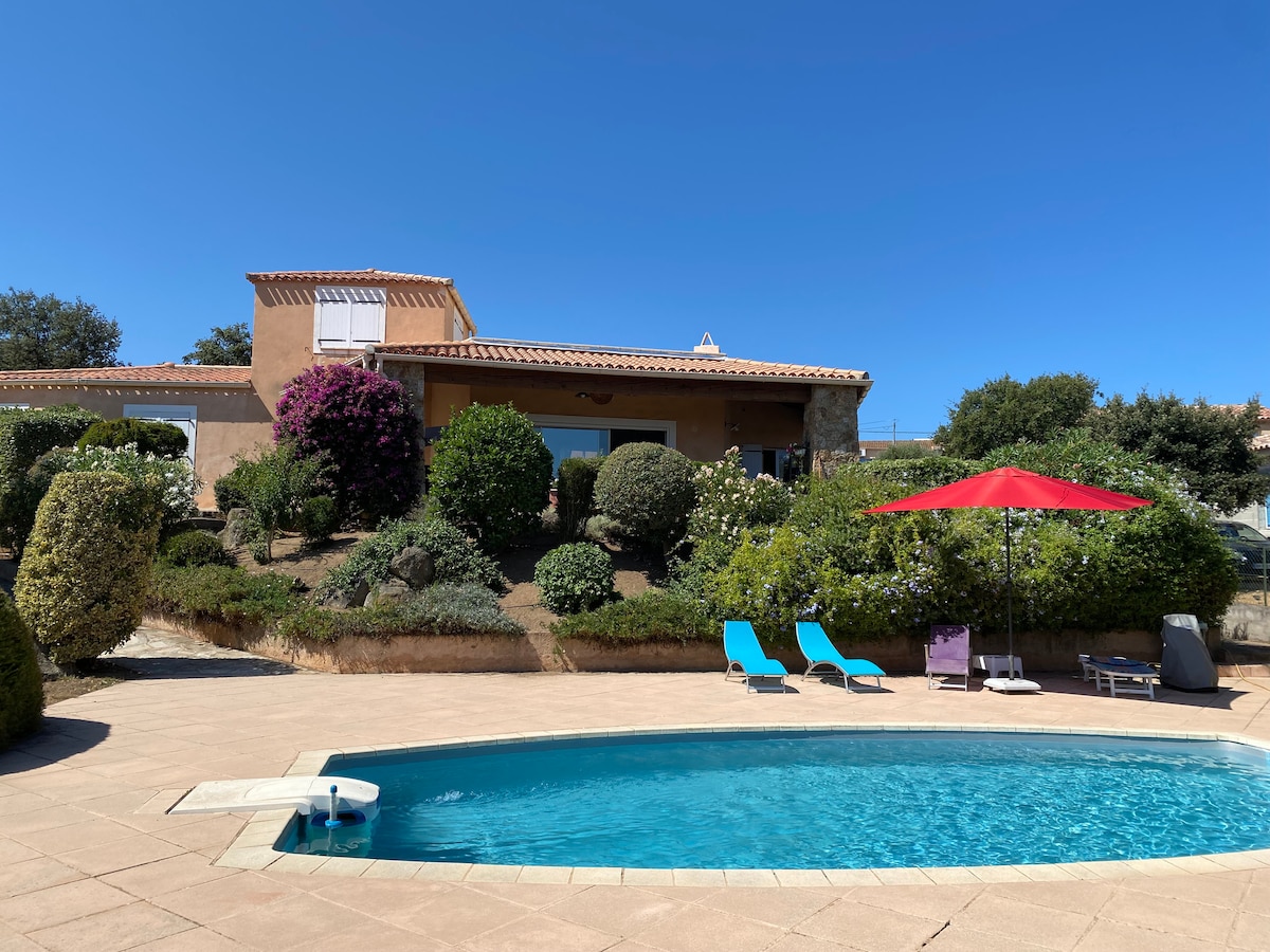 Notre logement offre une magnifique vue sur la montagne. Vous partagerez avec nous une piscine de 6X3M. La plage est accessible à pieds. Totalement rénové par nos soins, avec une décoration unique et raffinée. Vous disposez de 2 lits individuels dans la chambre et d’un divan lit 140X190 dans le séjour. La terrasse est équipée de fauteuils, table, chaises, barbecue. Isolés dans un immense jardin vous y serez au calme absolu. Vos enfants et animaux pourront y circuler en toute sécurité