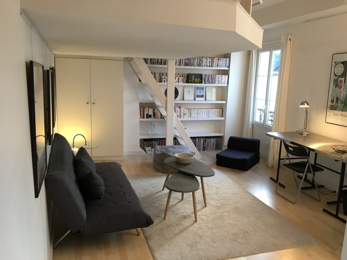 This exceptional space, located in Montmartre, was first a painter's studio before becoming a charming apartment. On one side, the living room offers a view of Amélie Poulain's grocery store. On the other side, the bedroom has a clear view, facing south. There are no flights of stairs to get to it. It is at the groundfloor.
