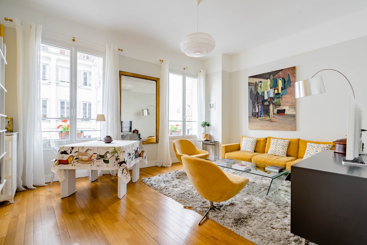 Quiet traditional Parisian apartment in a 19th Century dressed stone building and street on 5th floor with elevator : double living room, bedroom, fully equipped kitchen (dish washer and washing machine/dryer), balcony and private underground parkplace (4 minutes on foot). I furnished and decorated it with love, including paintings. In a neighbourhood vibrant of shops and restaurants, it is 2 minutes on foot from the Metro, from which all Paris must-sees are within a 13-30 minute range.