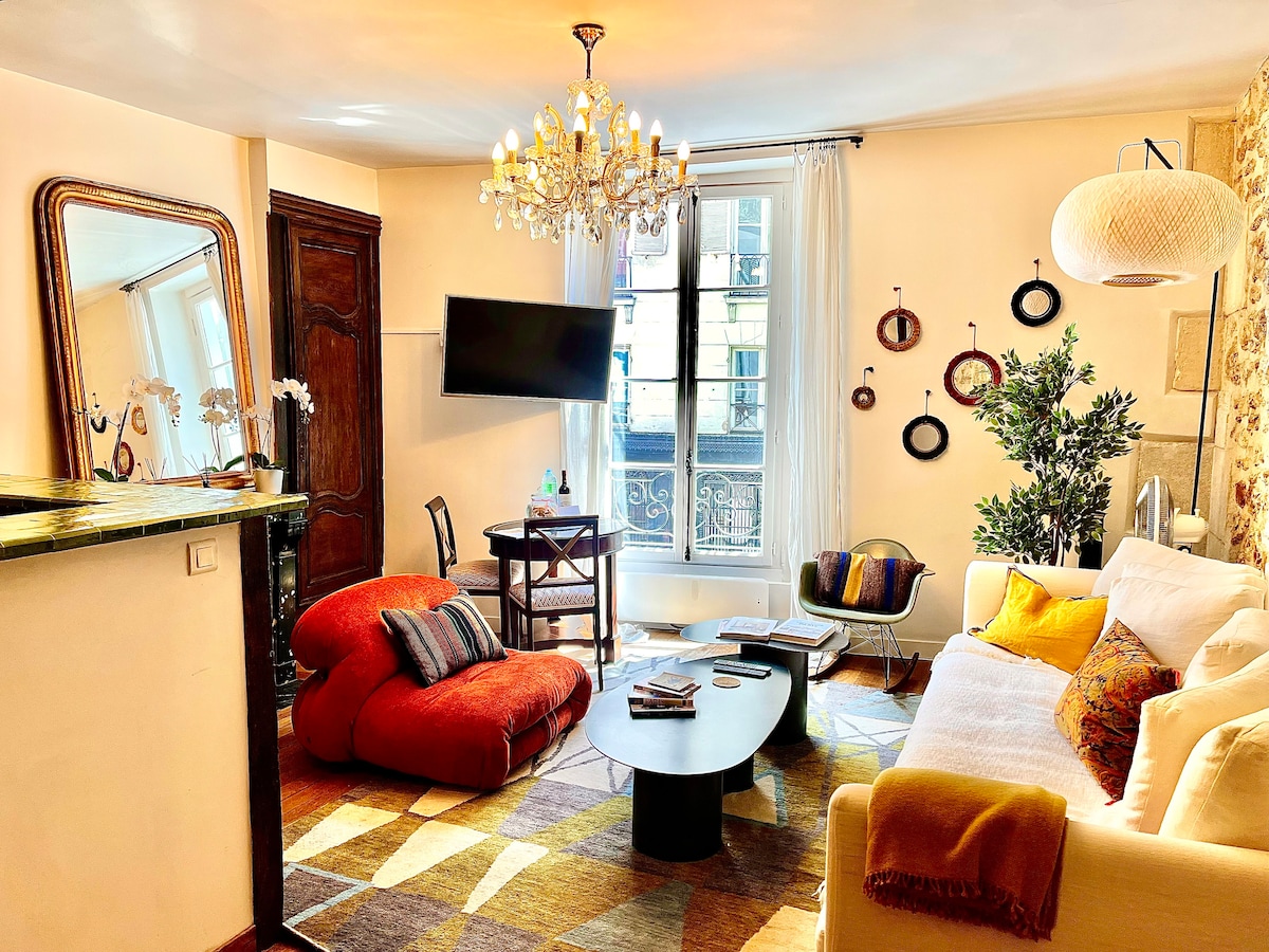Authentic Paris at its most bohemian chic! This bijoux duplex apartment on the Left Bank in the heart of St. Germain is situated in a historic 17th century building just opposite the Musee Mailol and Fontaine des Quatre Saisons. The flat has been recently and totally renovated. The rustic stone walls and antique ceiling beams have been exposed and carefully restored on both levels. Modern design elements and understated hip luxury integrate with the buildings original features to make this flat the perfect city escape for the discerning traveler. The spacious and quiet bedroom on the 2nd floor features a French-made luxuriously comfortable king size bed (180cm) complete with the finest feather and hypoallergenic (upon request) bedding, built in closet, oak chest of drawers and a full length floor mirror. The ultra contemporary ensuite bathroom is decorated in calming hues of gray and beige, has a rain shower, toilet, sink and a towel heater. On the first level a fully equipped kitchen/ living and dining area have been tastefully outfitted with a mixture of modern classics and unusual finds, offering the utmost in comfort in a cool and casual setting designed to make your stay in the City of Lights a very special one. Private access via the main entrance, this duplex is an independent apartment. We are always available for anything that you might need during your stay, and happy to assist in making your time in paris perfect! This chic one bedroom duplex is ideally located in the heart of the sought-after Rive Gauche/St. Germain neighborhood. The lively and cultivated Left Bank district boasts some of city’s finest shopping, dining and culture. Here is where you’ll find hip one-of-a-kind boutiques to high-end designer fashion, antique galleries (Carre des Antiquaires), as well as many modern-classic design shops. An array of delightful culinary offerings and dining experiences at every turn make this arrondissement quintessential Paris at its very best! The recently opened Beau Passage, adds yet another gourmet haven to the neighborhood. We are situated within a short walking distance to many of the main attractions of central Paris including: The Louvre, Musee D’Orsay, Musee Maillol, Seine River, Invalides, all of St. Germain and the Latin Quarter, Notre Dame Cathedral, Le Bon Marche department store, Cafe Flore, Cafe Deux Magots and more. There are 3 Metro stations serving this area: Rue du Bac on Line 12, Sevres Babylone on Line 10 and 12 and St. Germain des Pres on Line 4. 1. Please note that due to the historic nature of the building and certain restrictions on construction, the flat is not air-conditioned. A fan is provided, however, due to the the old thick stone walls the apartment stays rather cool even on the warmest of summer days. 2. The apartment has an interior stairway from the living/dining room to the bedroom/bathroom and therefore may not be suitable for those with limited mobility. 3. This apartment can only comfortably accommodate 3 people. Children above the age of 12 years old are welcome. 4. While the kitchen is very well equipped, there is no dishwashing machine.