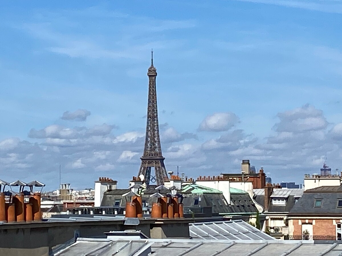 Top-floor haven with a large, sunlit balcony and an unobstructed Eiffel Tower view. Newly refurbished by a designer, it features an Italian shower, a comfy queen-size bed, and a quality sofa bed for groups of 3–4. Bright living/dining area, fast broadband and Netflix. Secure building in a vibrant neighborhood packed with cafés, restaurants, and shops. Metro station just 2 minutes’ walk. Perfect for couples, friends, or business stays.