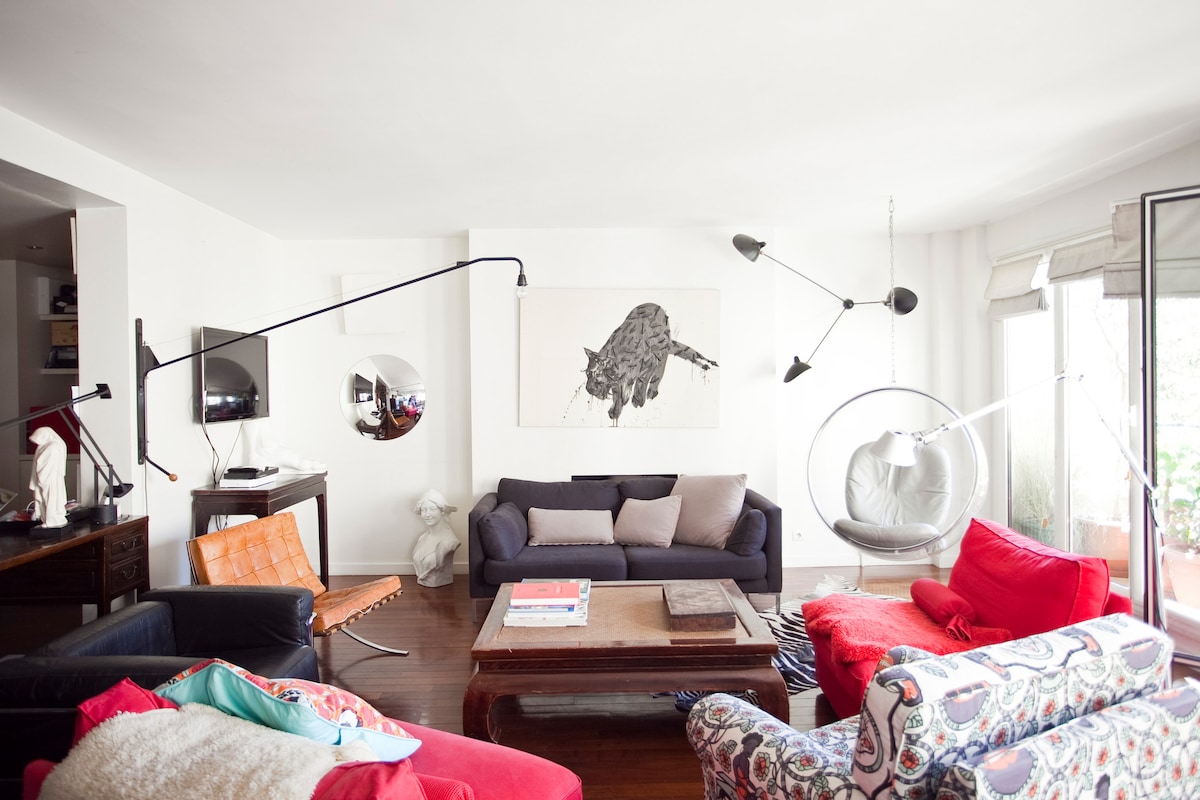 This loft is located in the heart of Montparnasse, in a very bright and quiet building! Montparnasse is an amazing district in the center of Paris!! It is very lively with a lot of places where to eat and drink! And with an easy access to all transportation. Apt very elegant: it has a bedroom, a bathroom, a workspace with a desk, an equipped open kitchen, a living room with a dining table, and a sofa bed. Fully equipped with air conditioning, Smart TV, speaker, dishwasher, washing machine.