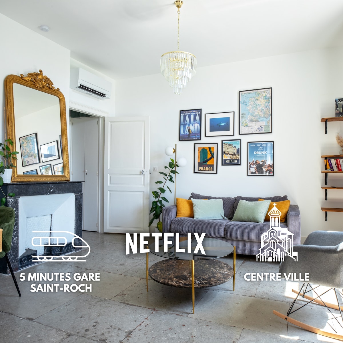 ✨Bel appartement haussmannien haut de gamme, idéalement situé à 100m de la gare Saint-Roch. Traversant et lumineux, il offre de beaux volumes avec moulures et parquet. En RDC ses grandes fenêtres baignent les pièces de lumière naturelle. Il est tout juste rénové, et vous offrira tout ce dont vous avez besoin pour séjourner à Montpellier 🍀 •1 minutes de la gare St Roch • proche de toute commodité •CLIMATISATION et CHAUFFAGE dans chaque pièce •vélos ok !( dans la cour) Draps et serviettes✅