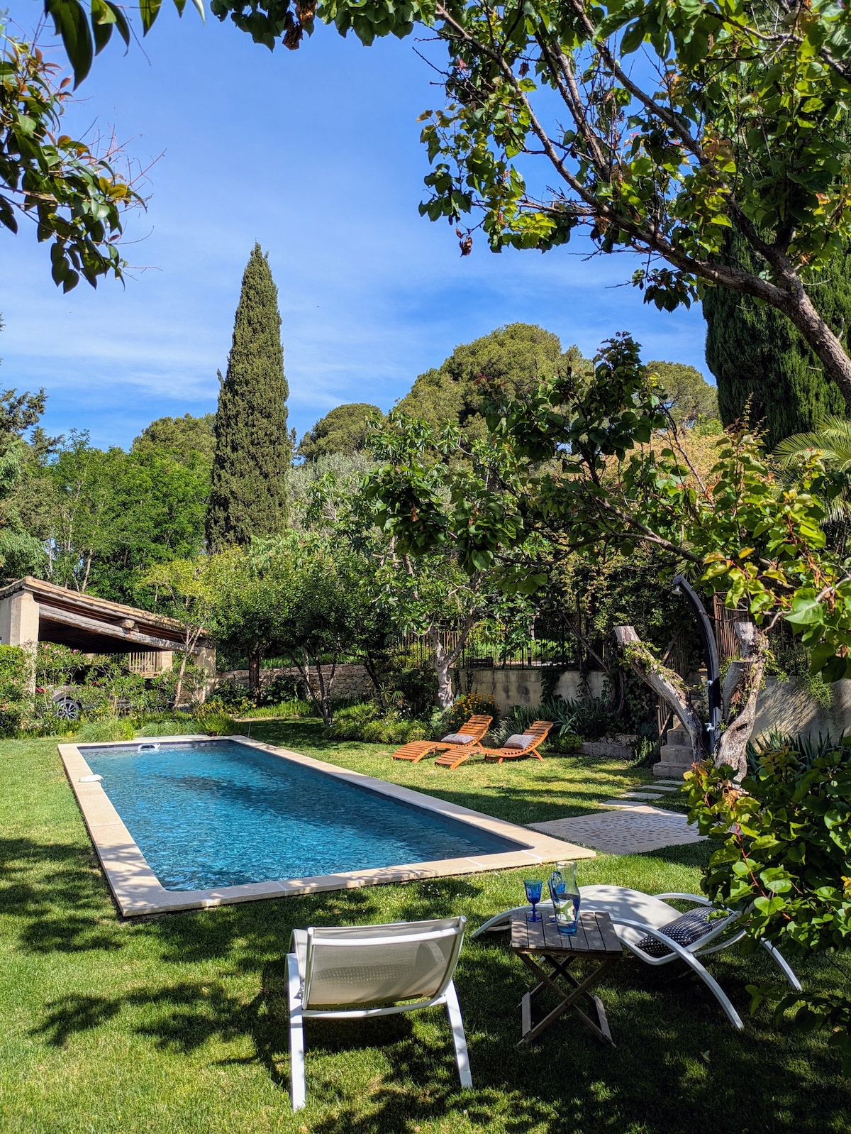 Mas Les Pins (on 2,600m²) has a rich history and is part of a 12th century church complex and old wine cellars. This verdant ★★★★ paradise is only 3 km from Montpellier's dynamic center (10 minutes by tram) and 10 km from the Mediterranean Sea. With 2 charming bedrooms, a well-equipped kitchen, a sunny living room, 2 large terraces to enjoy an aperitif overlooking the extensive garden and pine forest and a 12m salt water pool, you have everything you need for a relaxing stay.