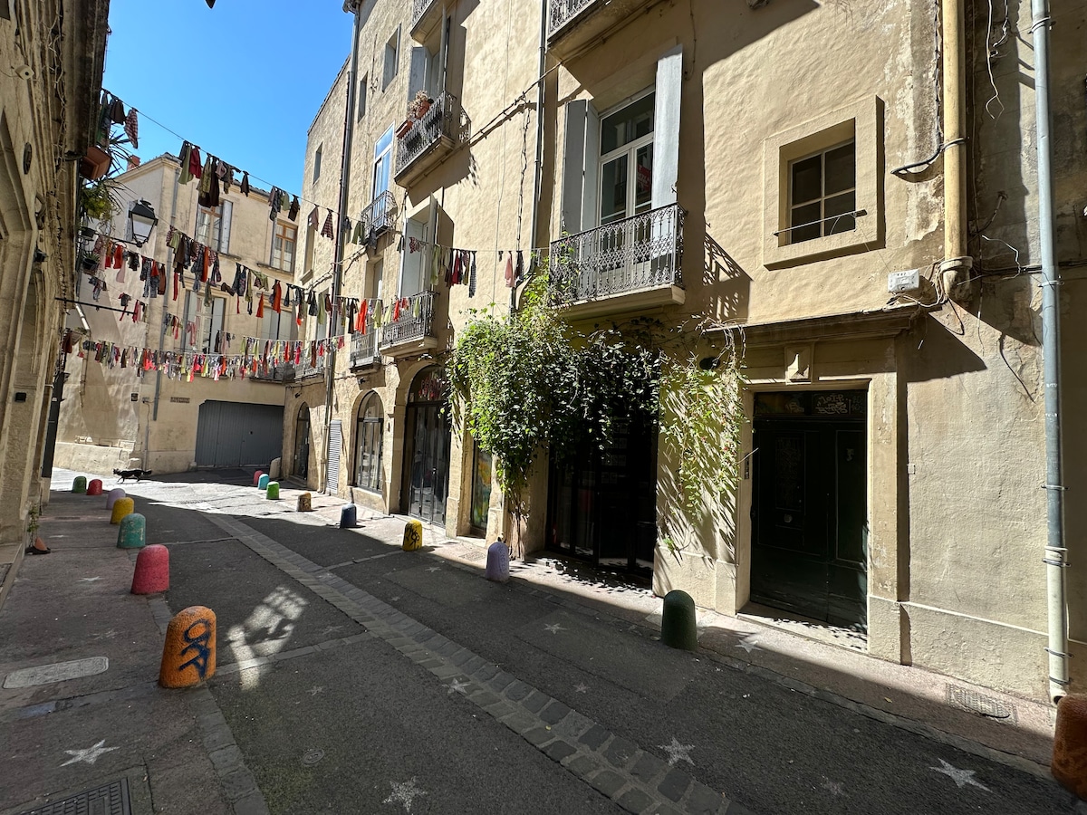 Elegant, central apartment 50 m from Place de l'Eglise Saint-Roch, Montpellier's tourist and pedestrian district. 68 m2, spacious, parquet flooring, on the 1st floor (no elevator) of an 18th-century building, 2 large windows/balcony overlooking the famous, lively and festive rue des sœurs noires. (In the street: bookshop, designer, second-hand goods shop, hairdresser, 4 bars/restaurants). Not suitable for small children.