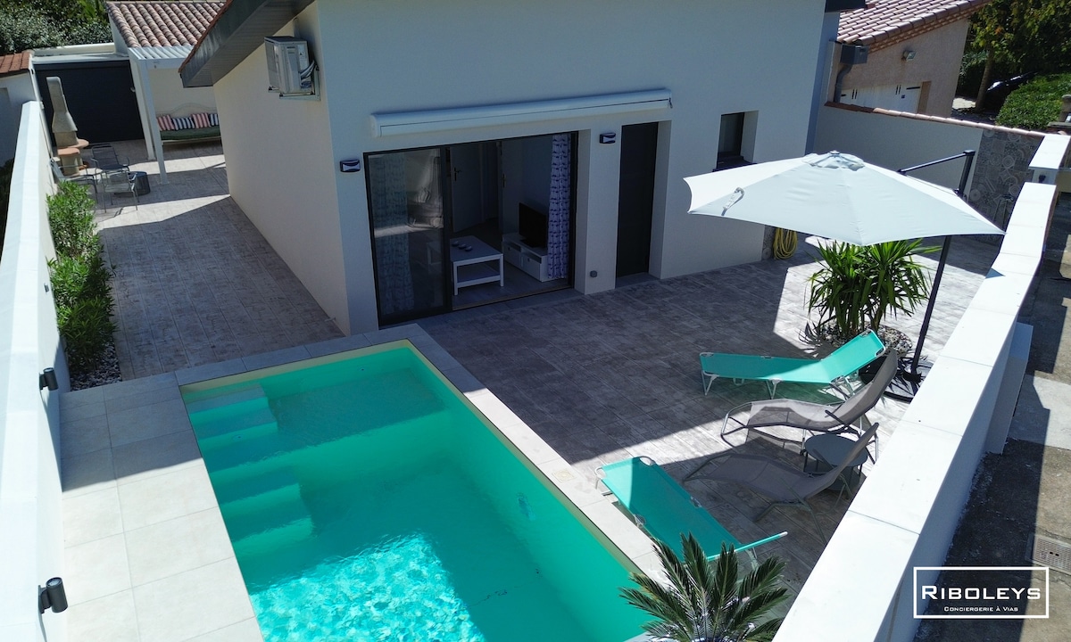 superbe maisonnette sans vis a vis . Maison 45m² plus jardin privatif 35m² Située à 100 m de la mer Dans un quartier résidentiel calme Chambre avec 2 lits double Cuisine-salle à manger- salon avec BZ Salle de bains avec WC Equipements : Micro-onde, four, machine à café Senseo et cafetière filtre, machine à laver Climatisation Internet, TV, lecteur dvd Planche et fer à repasser Jardin ombragé avec barbecue, salon de jardin, bains de soleil 2 vélos adultes