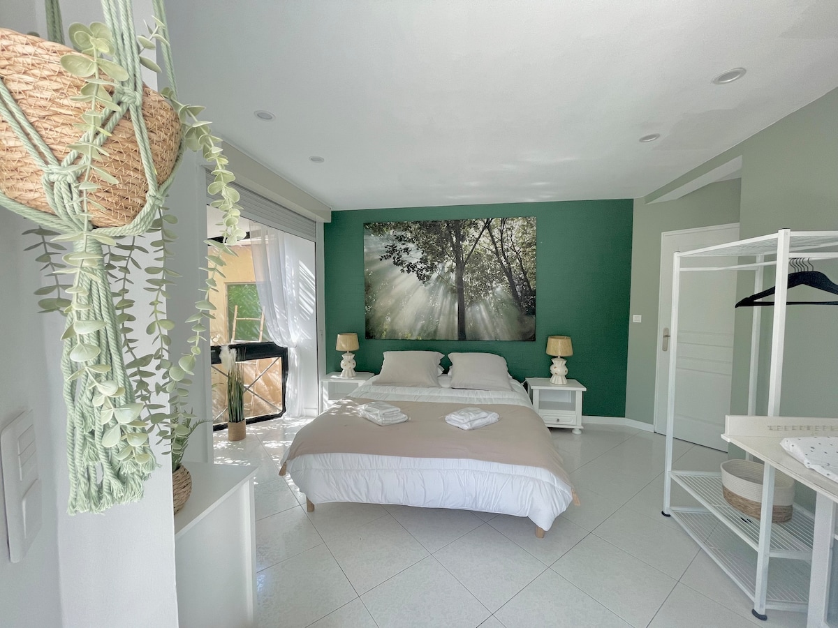 Découvrez un cocon d’élégance et de détente à la “Suite Casa Azul” dans une ambiance Ibiza. Profitez d’une baignoire balnéo apaisante, d’un lit queen-size surmonté d’un miroir au plafond, et d’un balcon avec vue sur le port. Ce havre moderne offre la climatisation réversible pour un confort optimal, une place de parking privée et une cuisine entièrement équipée. Plongez dans une expérience unique avec une décoration immersive vous faisant voyager et où confort et sérénité se rencontrent
