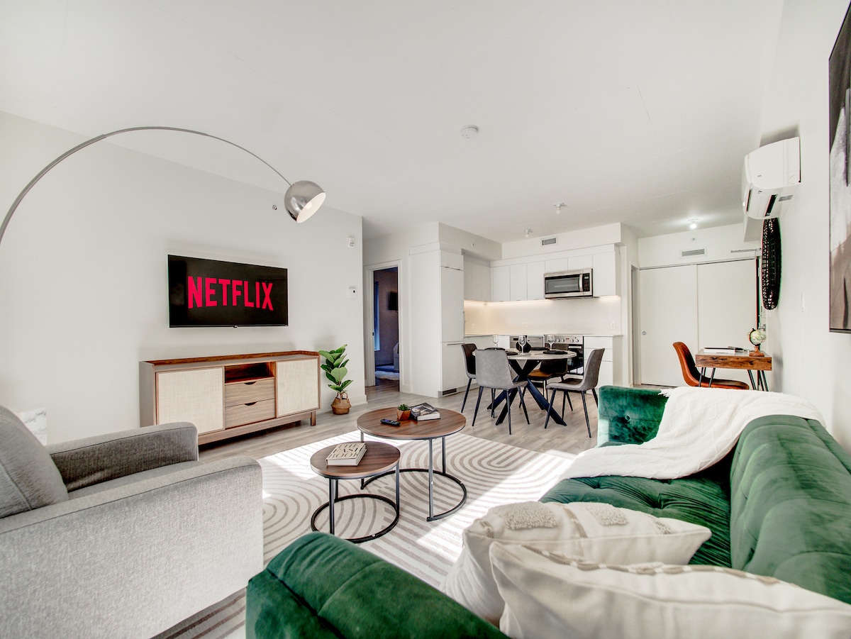 Welcome to our stylish 1-bedroom unit in Little Italy, Montreal! Designed for comfort and convenience, our space is perfect for business travellers. Accessible by a common elevator in a well-maintained building, enjoy a charming atmosphere. Relax in a cozy queen-size bed, use the fully equipped kitchen, and unwind in the spacious bathroom and tub. Stay connected with free wifi, and Netflix, and enjoy a welcome starter amenity kit with fresh coffee and treats.