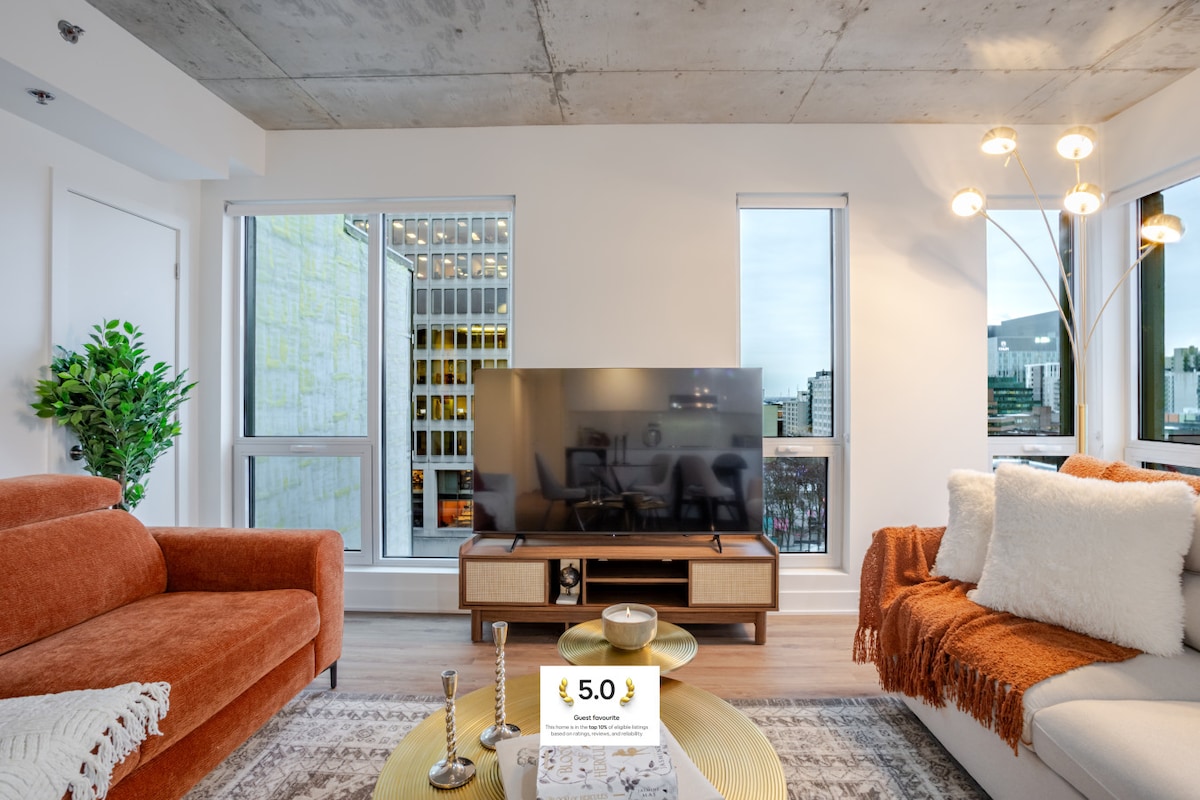 Enjoy your stay in the heart of the city ! Brand new TDC 2 downtown luxury with direct Bell Center access! Revel in comfort in our fully furnished and equipped one-bedroom condo with own private balcony! Your stay includes access to a sauna, pool, gym, skylounge, gaming room, lounge, and terrace with multiple barbecues. Free underground parking, with the subway just minutes away. Without stepping outside, the city is yours to explore. Plus, unwind with complimentary Netflix for the perfect stay