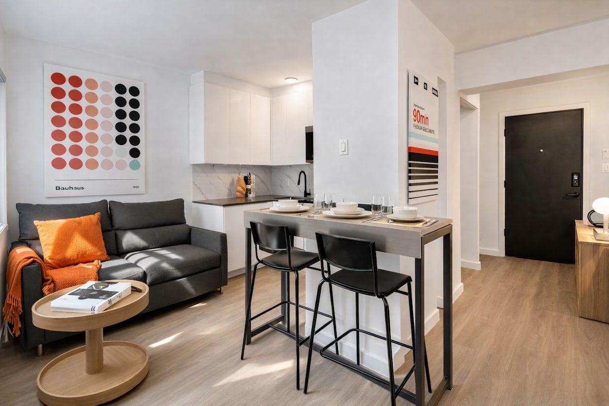 Plaza12 is a modern and stylish single bedroom apartment located in the heart of Rosemont la Petite Patrie (a borough 1 hour walk North or a 15 min public transit ride from downtown Montreal). It’s an area full of restaurants, cafés, shopping and entertainment, making it the ideal place to stay while exploring Montreal. The closest subway station is a 6 min walk away. The space features a fully-equipped kitchens. This space is not suitable for children below 13 nor for pets.
