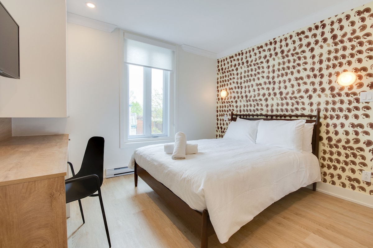 This elegant hotel room blends style and comfort, featuring a plush queen bed with premium linens. Located in one of Montreal’s most vibrant neighborhoods, you’re steps from cafés, bars, and cultural gems. Guests also enjoy access to a welcoming lobby lounge and a spacious basement with cozy seating, a pool table, and big-screen TV—perfect for work or relaxation.