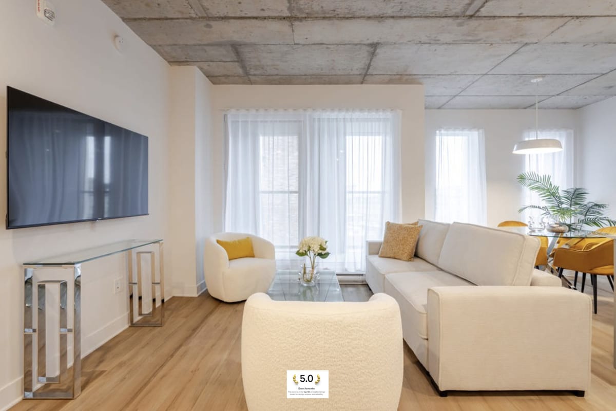 Enjoy your stay in the heart of the city ! Brand new TDC 2 downtown luxury with direct Bell Center access! Revel in comfort in our fully furnished and equipped one-bedroom condo with own private balcony! Your stay includes access to a sauna, pool, gym, skylounge, gaming room, lounge, and terrace with multiple barbecues. Free underground parking, with the subway just minutes away. Without stepping outside, the city is yours to explore. Plus, unwind with complimentary Netflix for the perfect stay